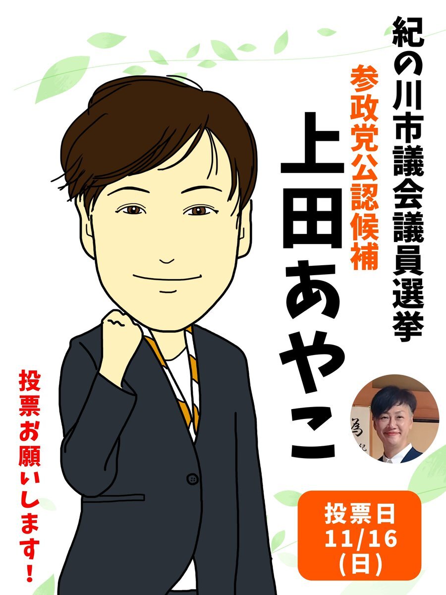 🗳️紀の川市議会議員選挙投開票日まで あと2日!     🔸参政党🔸    🟠上田あやこ🟠 @ueda__ayako 最後の最後まで応援よろしくお願いいたします❗️ 紀の川市の皆さま【上田あやこ】に一票を託してください‼️ #上田あやこ #参政党 x.com/sanseiwakayama…