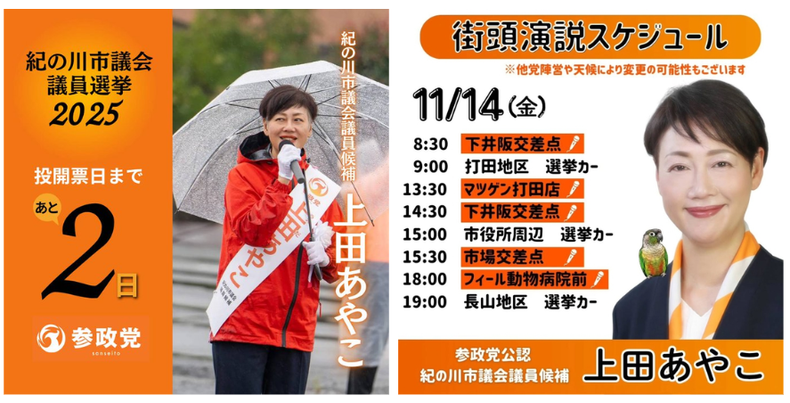 🗳投開票日:11月16日(日) 🟠参政党【上田あやこ】 本日最終日‼️ 街頭演説盛りだくさんで参ります💪🔥 応援よろしくお願いいたします🤲🧡 #和歌山県 #紀の川市議会議員選挙 #上田あやこ  #参政党 x.com/ueda__ayako/st…