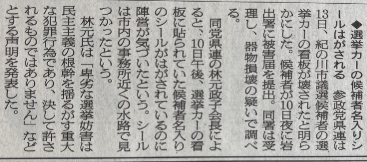 朝日新聞さんが記事にして下さいました。 参政党は今後どのような妨害に遭おうとも、それらをむしろエネルギーに変えて、国民が安心して暮らせる豊かな日本の再構築を目指して活動を続けてゆきたいと考えています。 #看板片方でも頑張ります #上田あやこ #紀の川市議会議員選挙