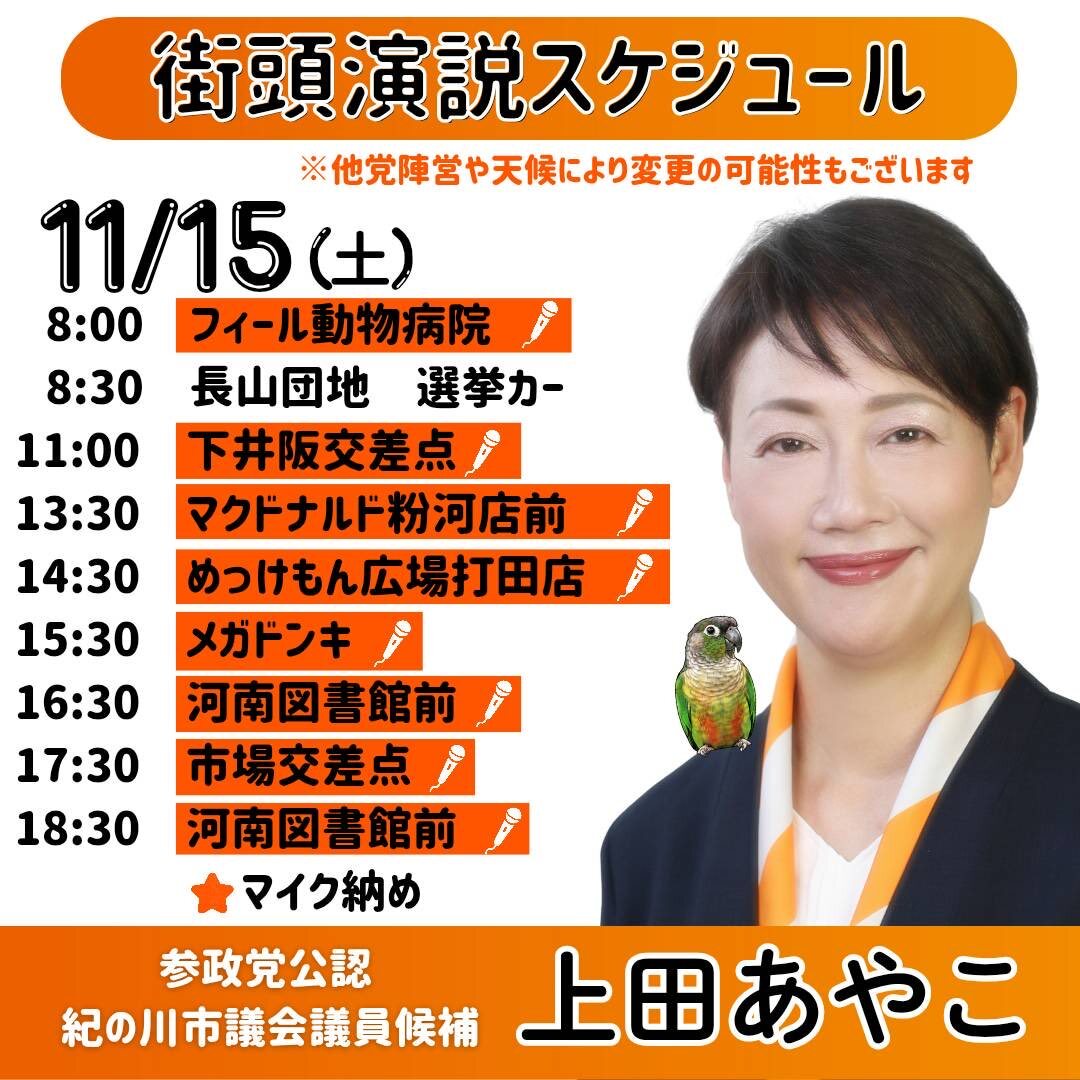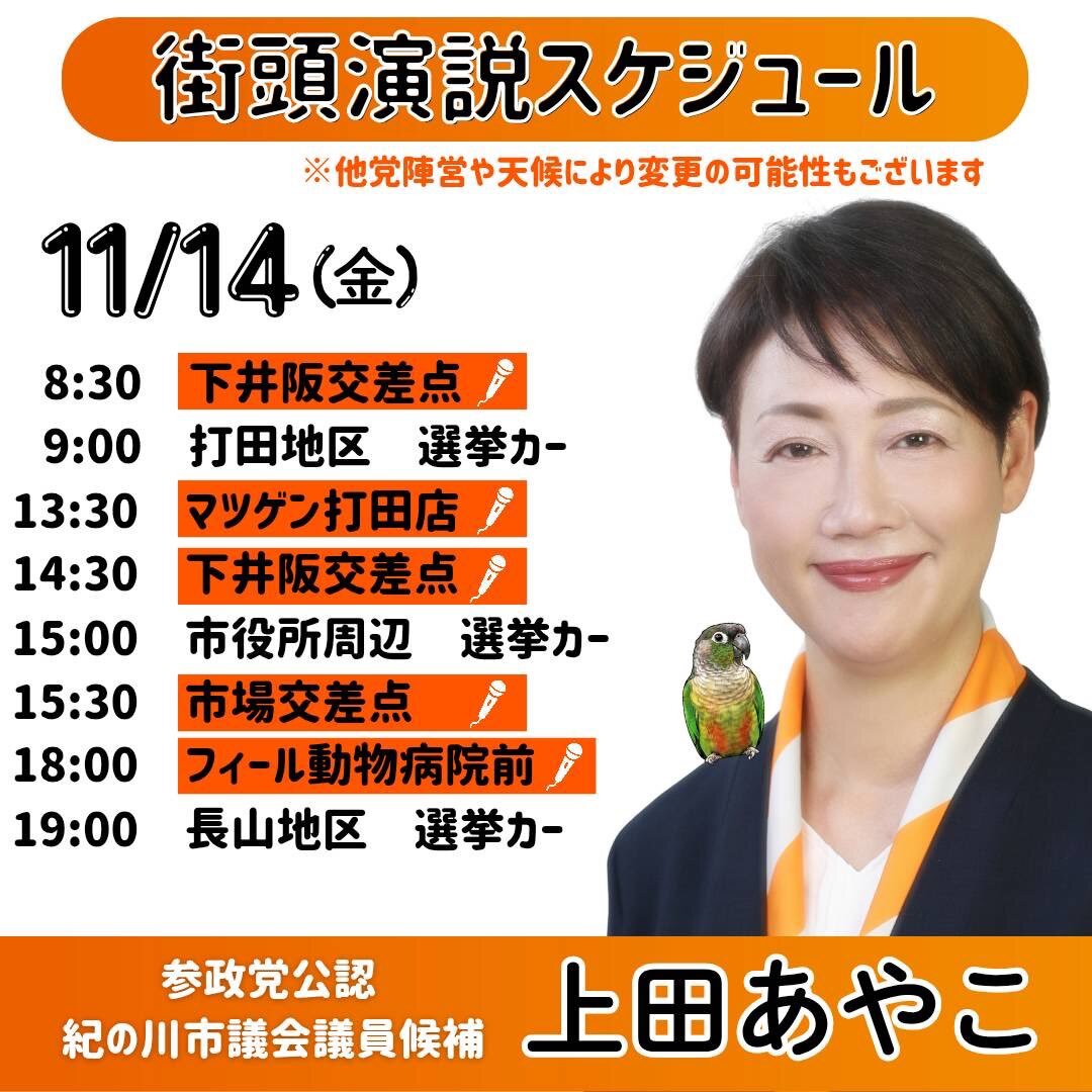 #参政党 和歌山県 紀の川市議会議員候補 上田あやこ(うえだあやこ) @ueda__ayako 本日11/14(金) の街頭演説予定 instagram.com/p/DQ_utZvD6S1/ 08:00~ 下井阪交差点 09:00~ 打田地区(選挙カー) 13:30~ マツゲン打田店 14:30~ 下井阪交差点 15:00~ 市役所周辺(選挙カー) 15:30~ 市場交差点 18:00~ x.com/sanseiwakayama…