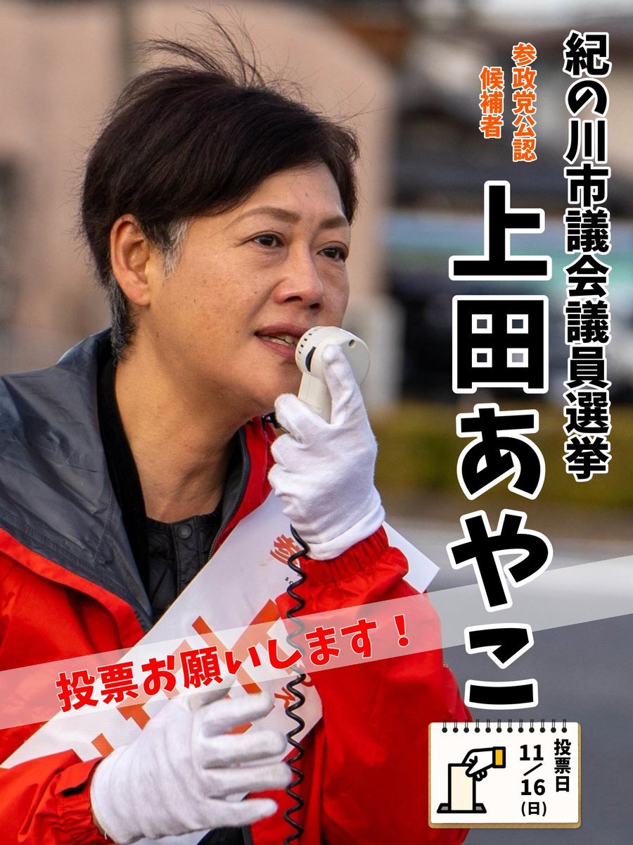 紀ノ川市議会議員選挙 🔶上田あやこ候補🔶を絶対 市政に送り込むぞぉー❣️ 明日11月16日(日)投票日🗳️ ⚠️応援は本日23:59まで⚠️ #紀ノ川市議会議員選挙 #紀ノ川市 x.com/ueda__ayako/st…