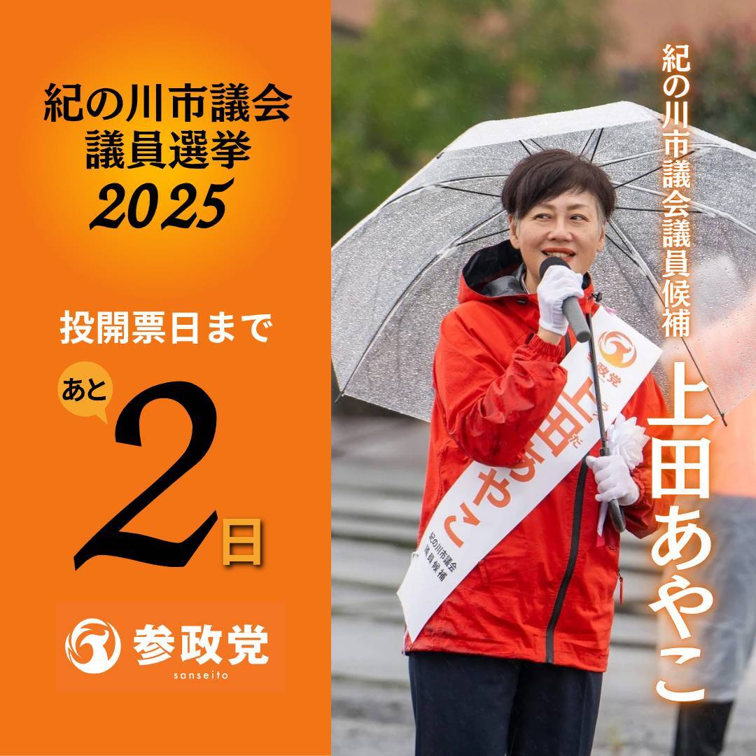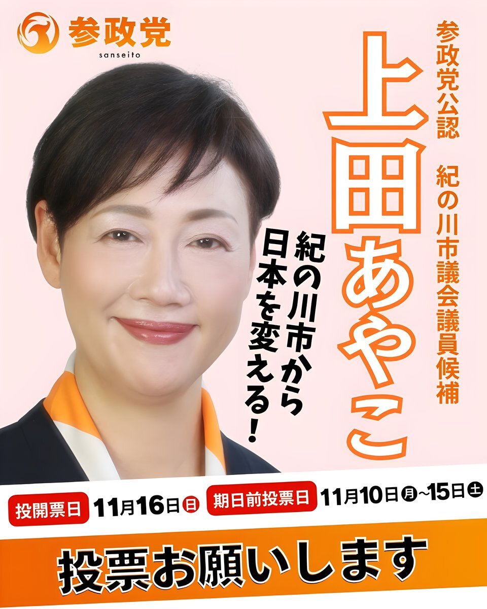 <和歌山県> 紀の川市に参政党(@sansei411)の新たな地方議員を誕生させましょう‼️ 本日は11/15(土) 選挙戦最終日です📢 🍀 上田あやこ (@ueda__ayako) 候補 🍀 応援よろしくお願いします 紀の川市議会議員選挙 投開票日 2025/11/16(日) x.com/sanseiwakayama…
