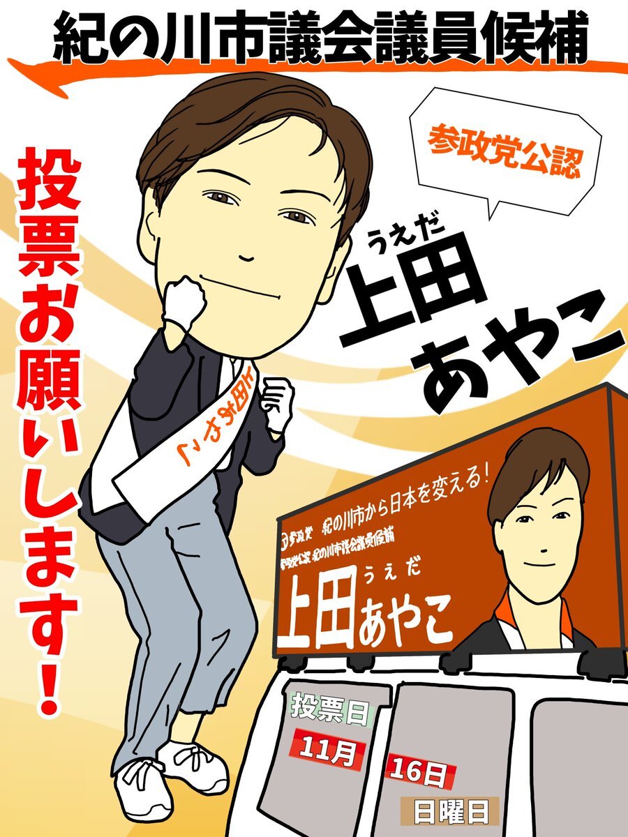 返信先:@sanseiwakayama紀の川市民の皆様 上田あやこ @ueda__ayako 燃える橙魂🟠🔥紀の川侍🔥 企業団体献金受け取りません! 市民最優先でお仕事します✨️ 何卒よろしくお願い申し上げます🙇 #上田あやこ #紀の川市 だれだ?そうだ💡うえだ🔥 イラスト みー @sanseitoufight 参政党応絵ん団