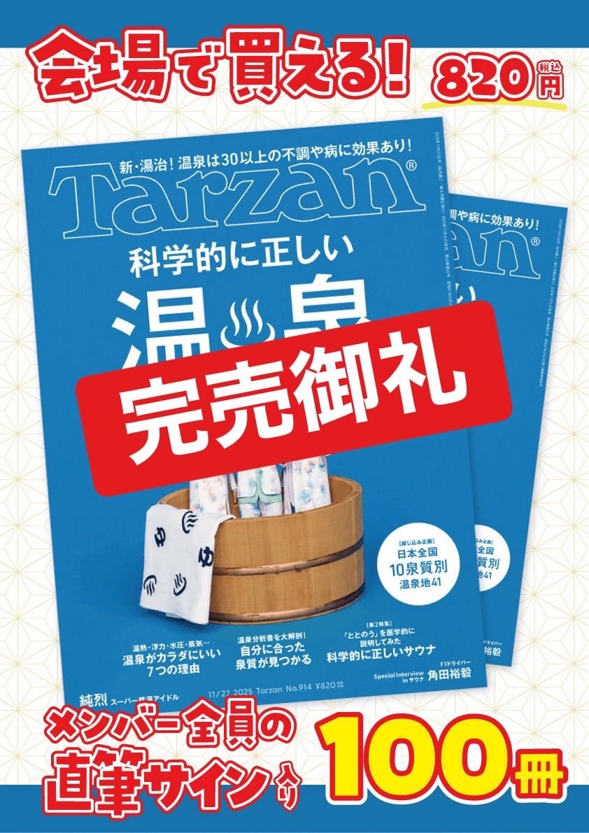 \📢完売御礼/ 🎉「#純烈御園座初座長公演」 本日、“初日”の幕が開きました! 純烈が表紙✨ “メンバー直筆サイン入り”『Tarzan』は、 100冊《完売》 いたしました🙇♀️💐 たくさんの皆さまに手に取っていただき 本当にありがとうございます。 今後の再販予定はございません 何卒ご了承くださいませ🙏 pic.x.com/Hk5I9nohDU