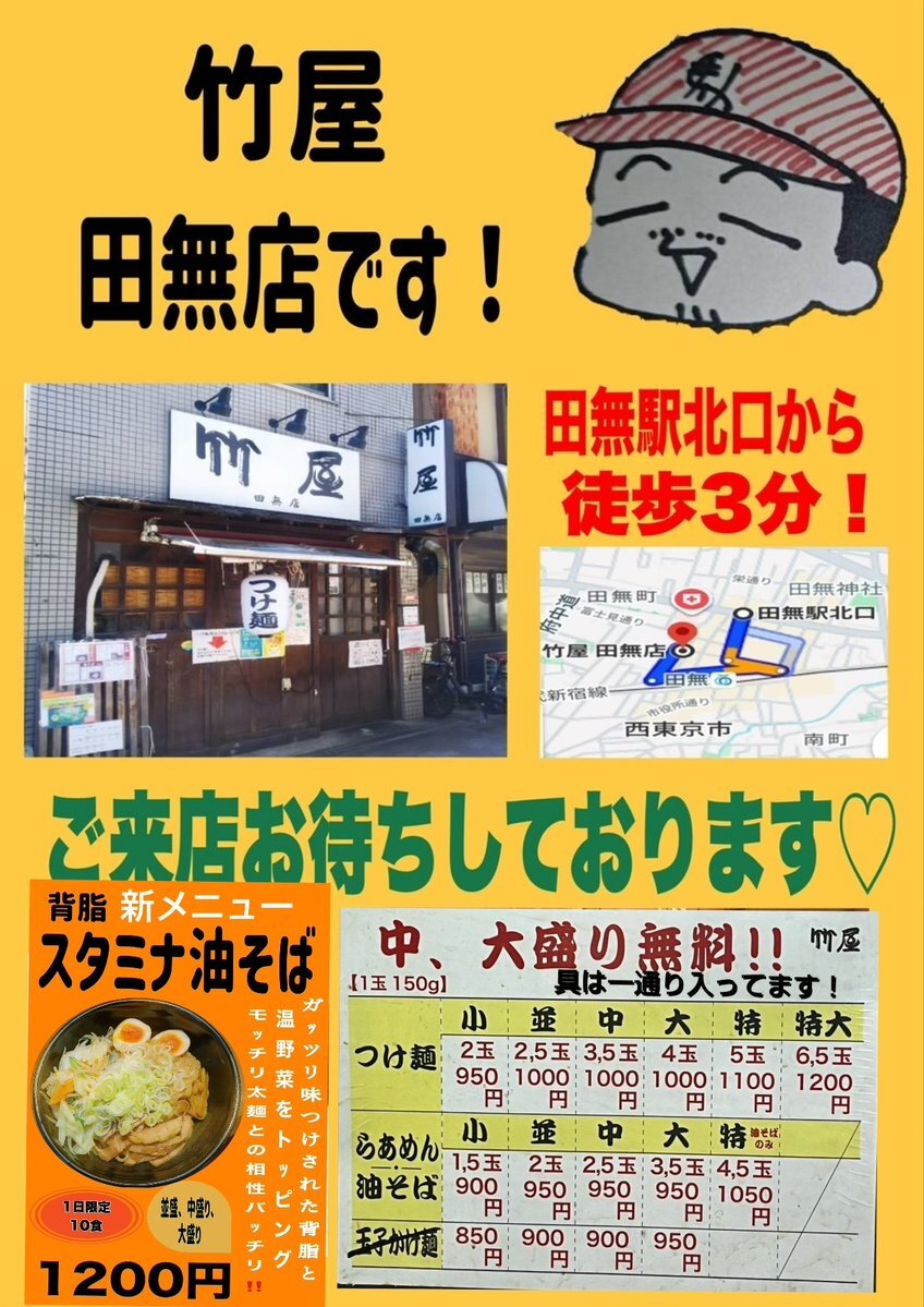 本日も11時〜15時、17時〜21時45分までの営業です✨ お待ちしてまーす😆😆😆😆 #背脂 #つけ麺 #らあめん #油そば #ミニ丼 #大盛り無料 #紙エプロン有り #食事 #竹屋田無店 #春馬 #田無 #西東京市 pic.x.com/QkSZFW0TSs