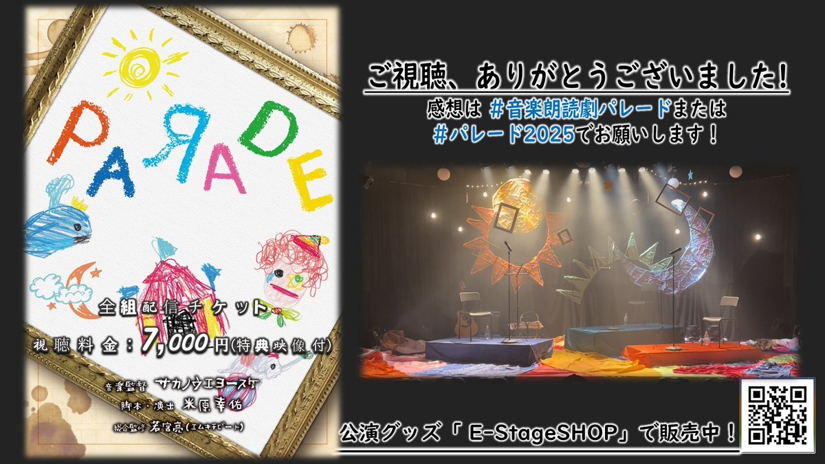 #音楽朗読劇パレード のアーカイブ販売期間が終了いたしました。期間中、たくさんのご視聴ありがとうございました! 視聴期間が残っている方は、残りの期間も引き続きお楽しみください🎪 年内の配信予定は終了です。2025年も大変お世話になりました。また2026年の配信もよろしくお願いします! x.com/bsd_live/statu…