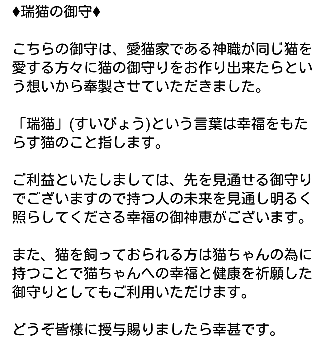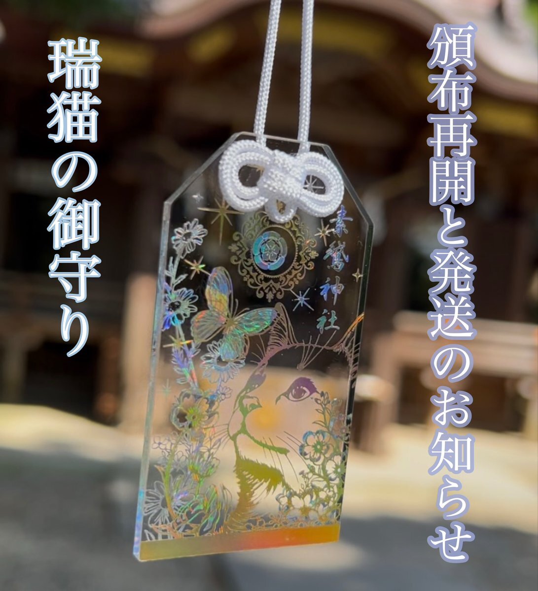 瑞猫の御守り頒布再開と郵送申込みの発送開始のご案内です。 ♦︎10月25日(土)より頒布再開 ♦︎10月27日(月)より発送開始予定 (お申込みの早い方より日数を分けて順次発送いたします。) どうぞ皆様のご参拝を心よりお待ちしております。