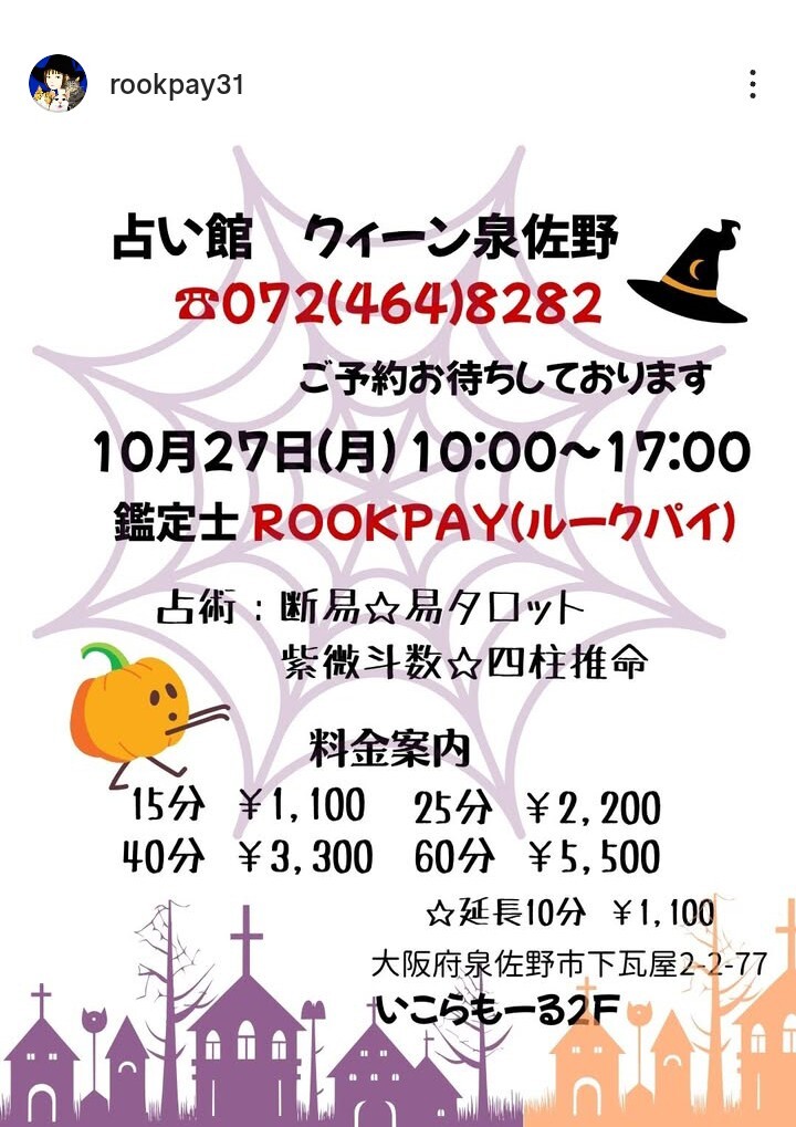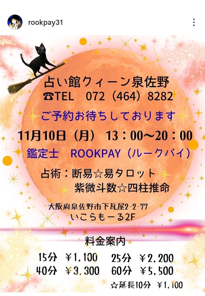 こんにちは🙇‍♀️ 10月27日月曜日の告知させていただきます🔮 秋らしくなってきましたね😌年末まであっという間に過ぎてしまいそうですが😅気になることなどは今年中に🔮ケリをつけましょ👍 お待ちしております🙇‍♀️ #いこらもーる #占い #断易 #紫微斗数 #四柱推命 #易タロット #ROOKPAY pic.x.com/JlLqv2Ll05