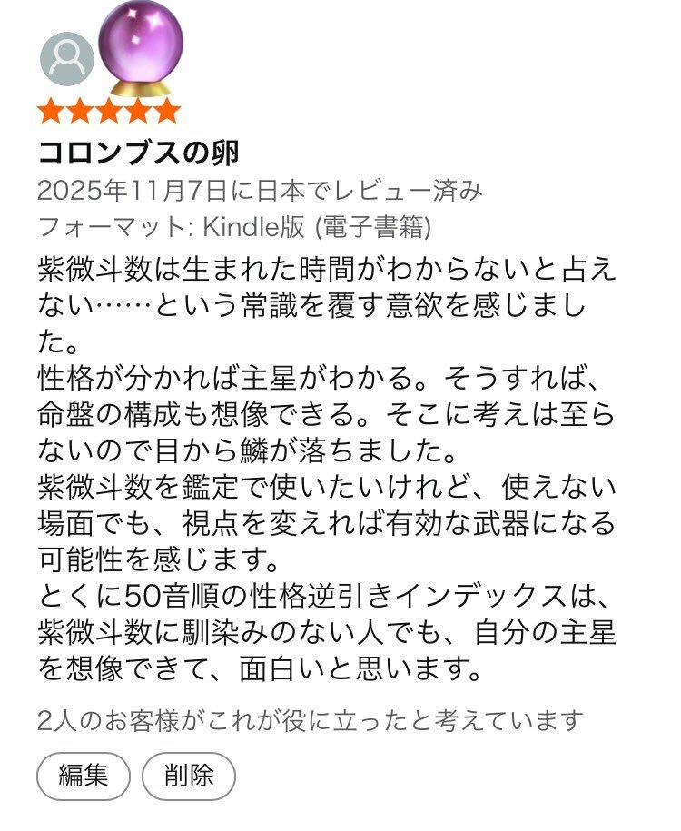 早速、逆引き紫微斗数のレビューをいただきました!ありがたいことです🙏 紫微斗数が、みなさんの人生の気軽な伴奏者になりますように✨ amzn.to/436qeYe #ほしよみ堂 #紫微斗数 pic.x.com/DW8HzExx7e