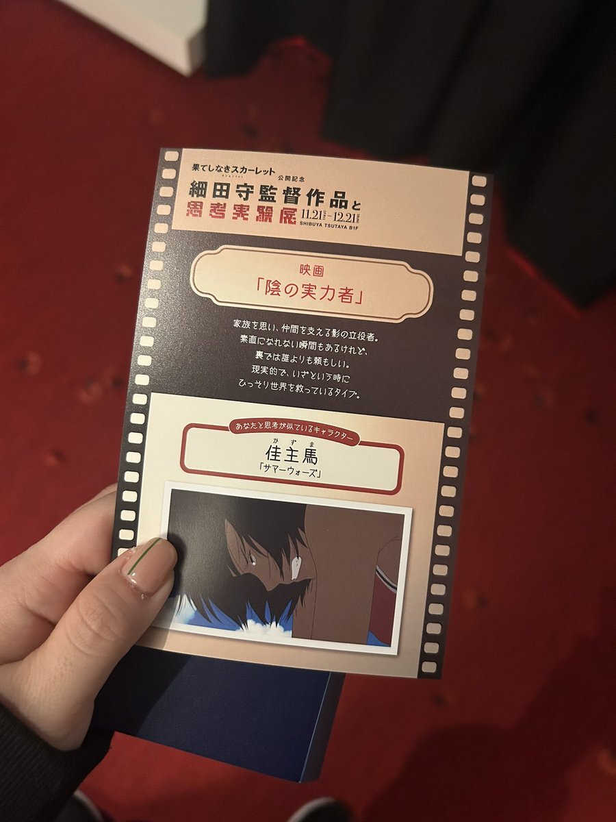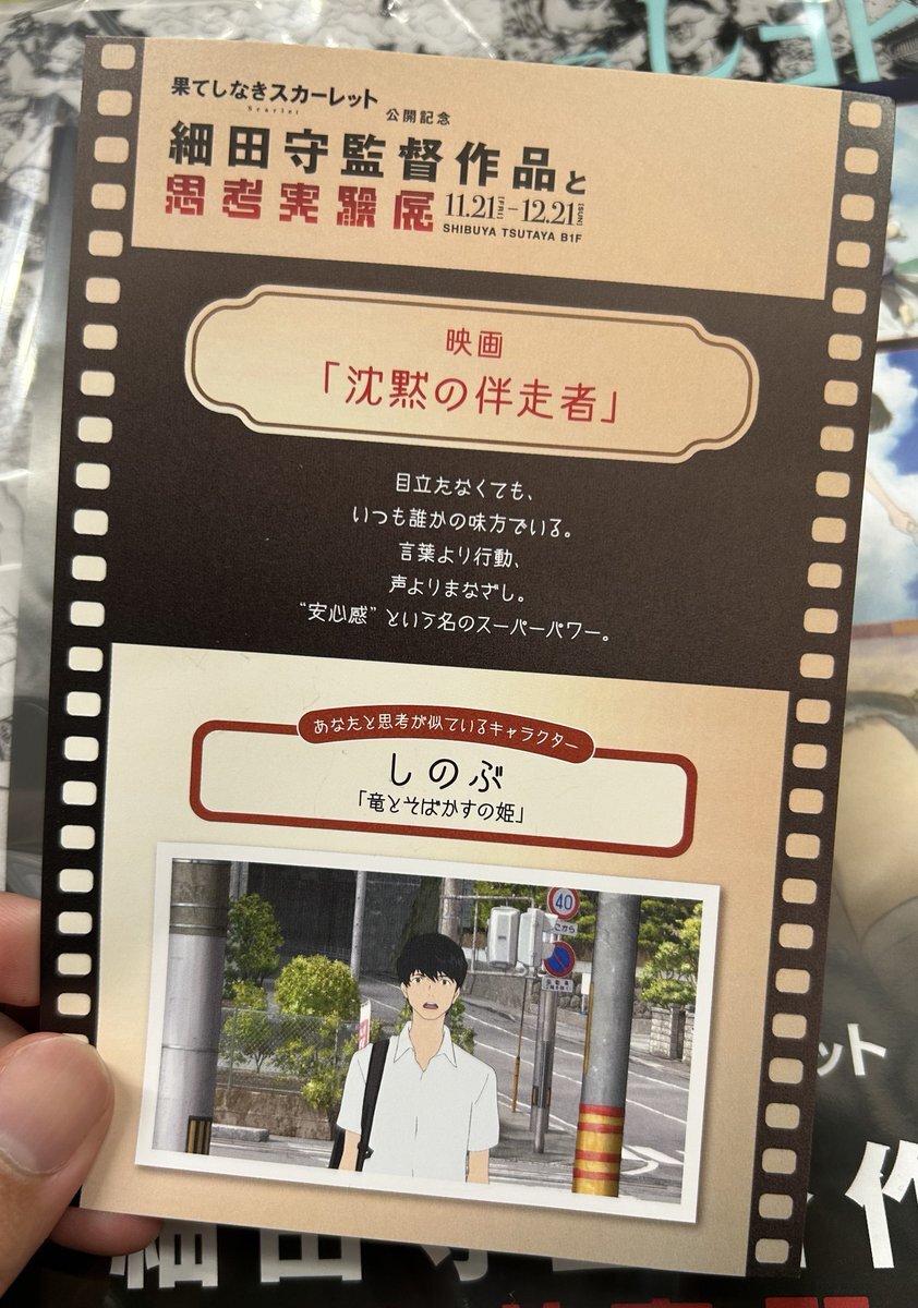 #細田守と思考実験展 自分が選んだいくつもの選択肢の結果で最後に自分だけの映画のタイトルと細田守監督作品で思考が似ているキャラを渡してくれるんだけど、自分が最新作の主人公だったので 「結局新作PRだからかぁ?」 と邪推ひたけどこのキャラ出るのは珍しいらしいので皆もやってみて(笑) pic.x.com/fkNBIIqMBq