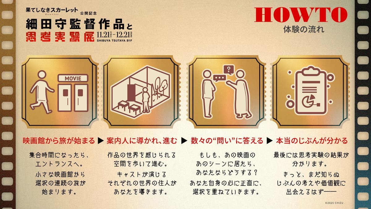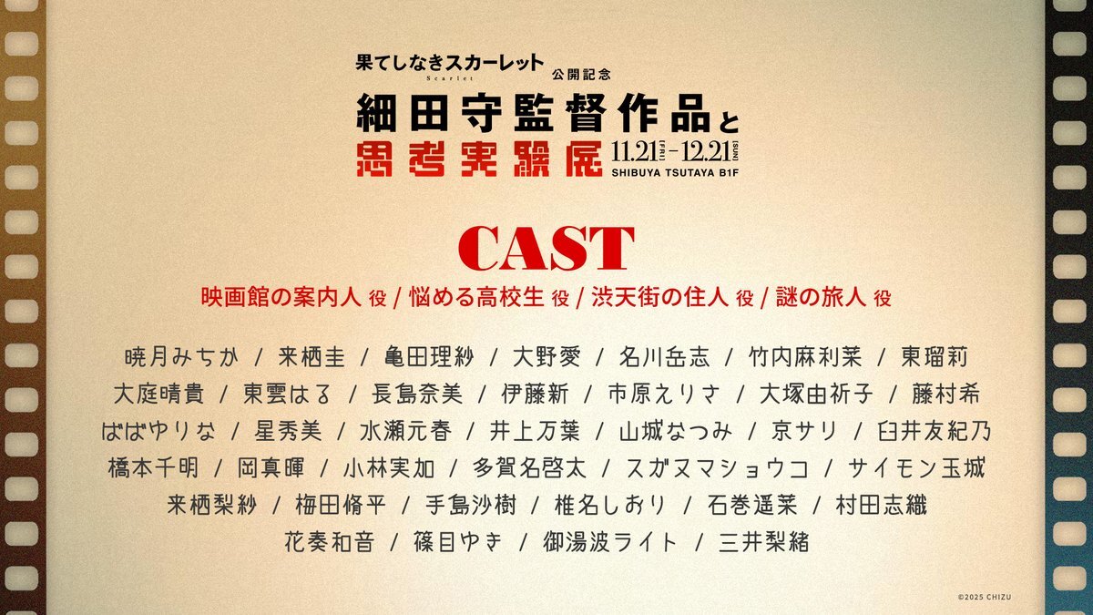 ◢◤出演キャスト解禁!◢◤ #細田守と思考実験展 で 参加者を導くキャストを公開します!☑️ さまざまな世界の案内人たちが、 映画館から始まるあなたの旅の手助けをします。 🗓️11/21〜12/21 📍SHIBUYA TSUTAYAにて ▼チケット販売中!▼ shikoujikkenten.com/scarlet