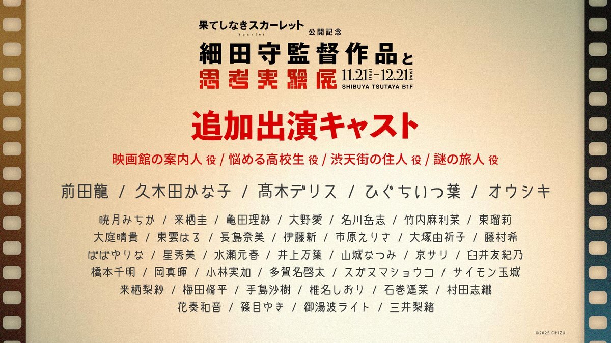 ◢◤出演キャスト追加発表!◢◤ #細田守と思考実験展 で 参加者を導くキャストを追加発表!☑️ さまざまな世界の案内人たちが、 映画館から始まるあなたの旅の手助けをします。 🗓️11/21〜12/21 📍SHIBUYA TSUTAYAにて ▼チケット販売中!▼ shikoujikkenten.com/scarlet