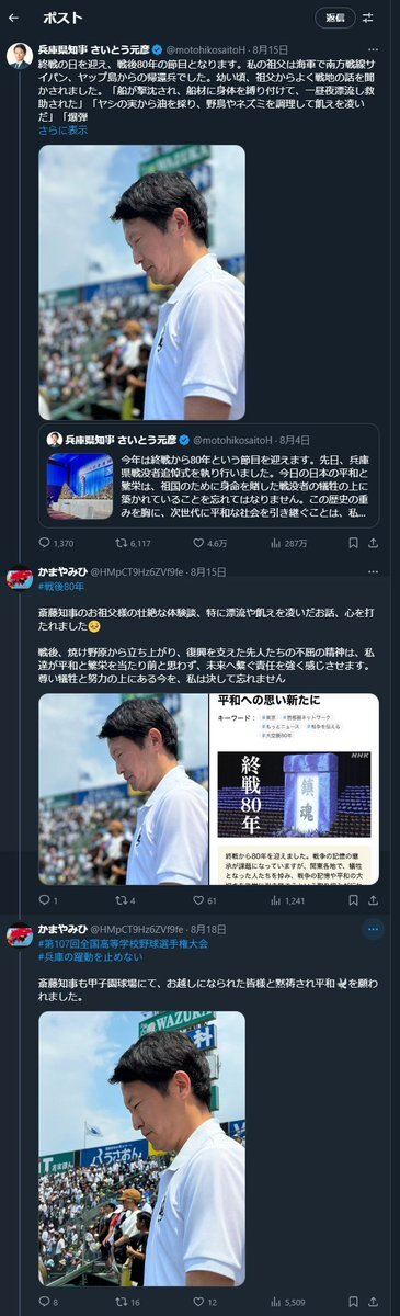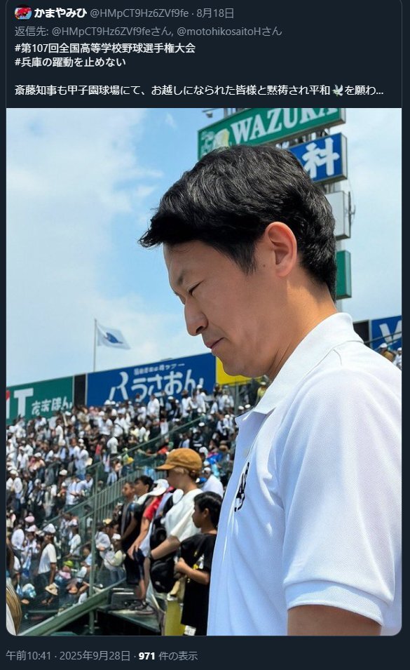 返信先:@motohikosaitoH#第107回全国高等学校野球選手権大会 #兵庫の躍動を止めない 斎藤知事も甲子園球場にて、お越しになられた皆様と黙祷され平和🕊️を願われました。
