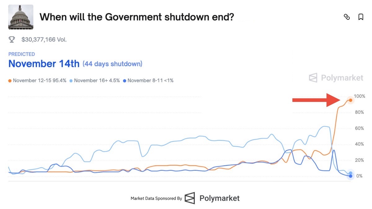 米政府閉鎖が今週中に95%の確率で終了する見込み(Polymarket予測)。11月14日(44日目)が予想され、経済への影響(GDP成長率1-2%減)も緩和へ。議会交渉が進展し、1月30日までの暫定予算案が鍵。市場は楽観視、DOGEの役割にも注目。 #米政府閉鎖 #Polymarket #経済予測 #トランプ政権 x.com/coinspace_/sta…