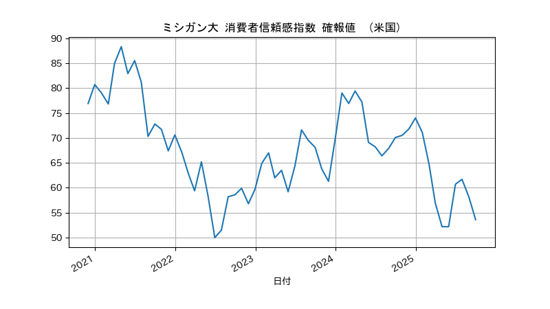 2025/10/24 23:00 発表 ミシガン大 消費者信頼感指数 確報値 (米国) 今回発表値: 53.6 予想: 55 前回発表: 55 出所: ミシガン大学サーベイ オブ コンシューマー #経済指標 #米国 #ミシガン大消費者信頼感指数 pic.x.com/XQgKzSVQUG