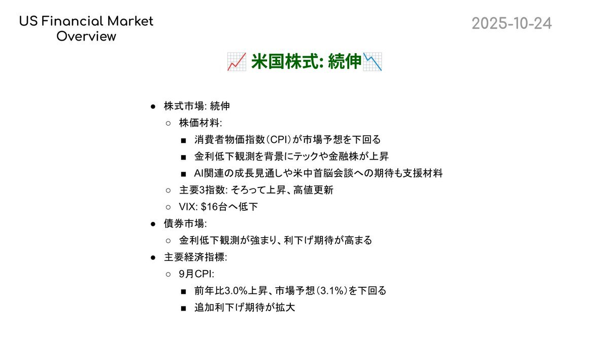 おはようございます☺️#経済指標 #米国株 #Headlines 米国市場は好調な3Q決算と予想より低いCPI指標から主要指数は全て場中で史上最高値を更新、市場は再びリスクオンムードに転換しました。 pic.x.com/5RMz0Ay4Ef