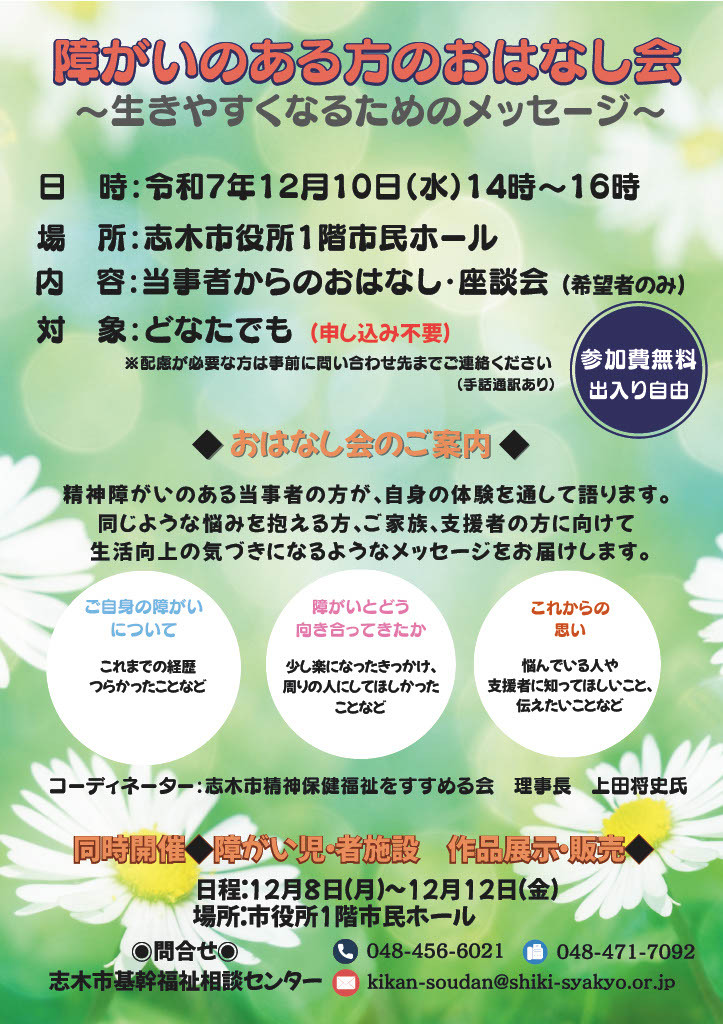 基幹福祉相談センターです。 12月に障がい理解促進事業を開催します! 今回は精神障がいのある方によるお話と障がい児者施設の作品展示・販売を予定しています。 障がいのある方やご家族・支援者、地域の方、どなたでもご参加いただけます。どうぞお気軽にお越しください😊 #志木 #障害者週間