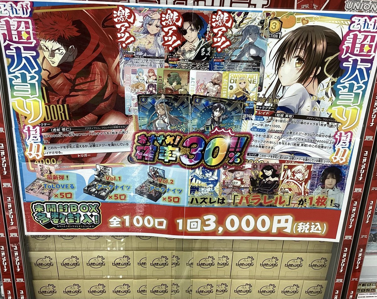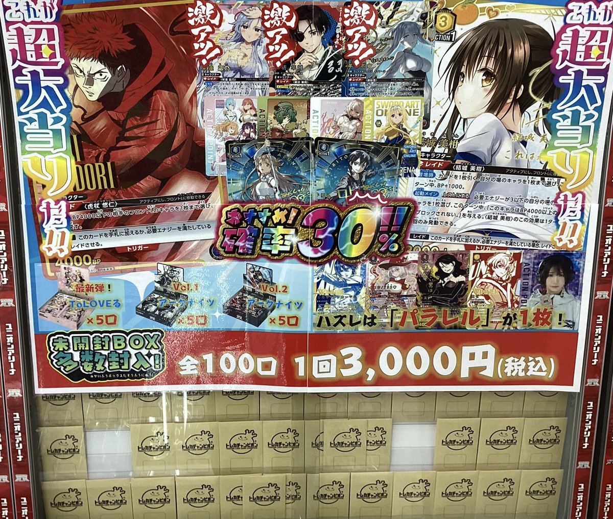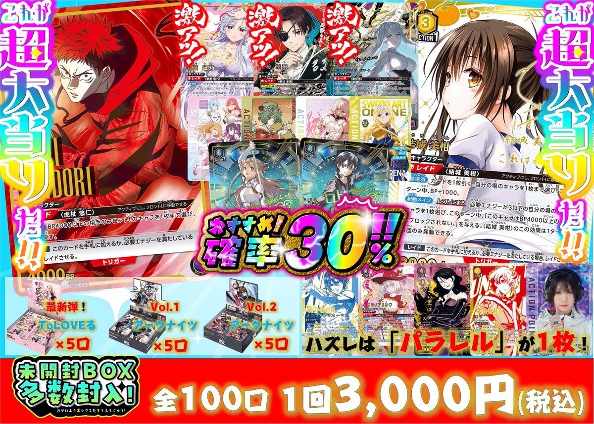 オリパ情報✨ #ユニオンアリーナ 3️⃣0️⃣0️⃣0️⃣円オリパ、全1️⃣0️⃣0️⃣口で 2025年11月14日AM9️⃣時より販売開始いたします🔥 超大当たり🎯は #結城美柑 #虎杖悠仁 他にも未開封BOX、 サイン入りや高レアリティの 人気カード、ACTION POINTが当たっちゃう‼️ ご来店お待ちしております🙏 #トレカ #ユニアリ pic.x.com/OmRdzfHbfK