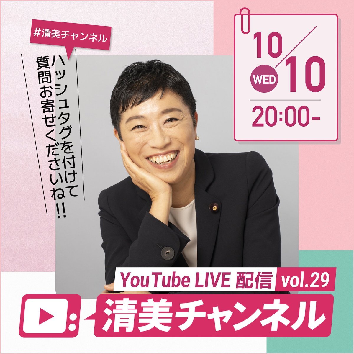 🎥10/10(金)20時から YouTubeライブ 清美チャンネルを配信します! 今回、初めての試みとして、皆さんからの質問やご意見にお答えすることを中心に番組を進めます。 ハッシュタグ #清美チャンネル をつけてぜひご投稿ください💭 皆さんのご視聴&ご投稿お待ちしています!