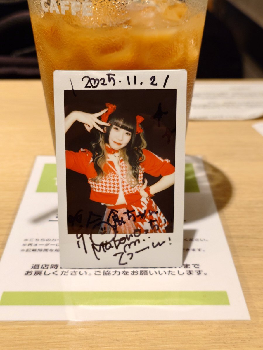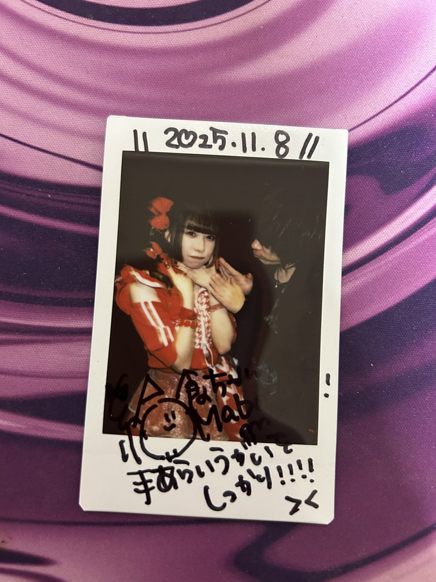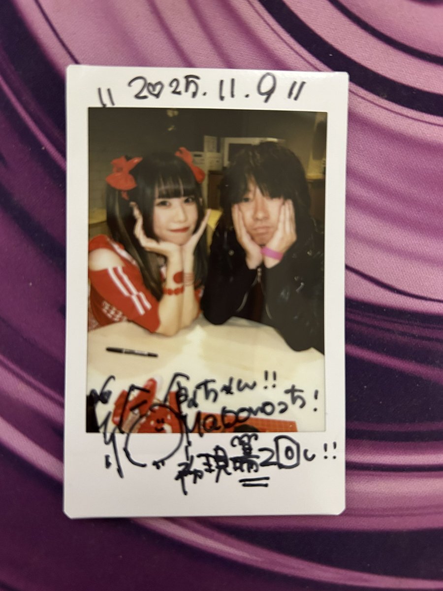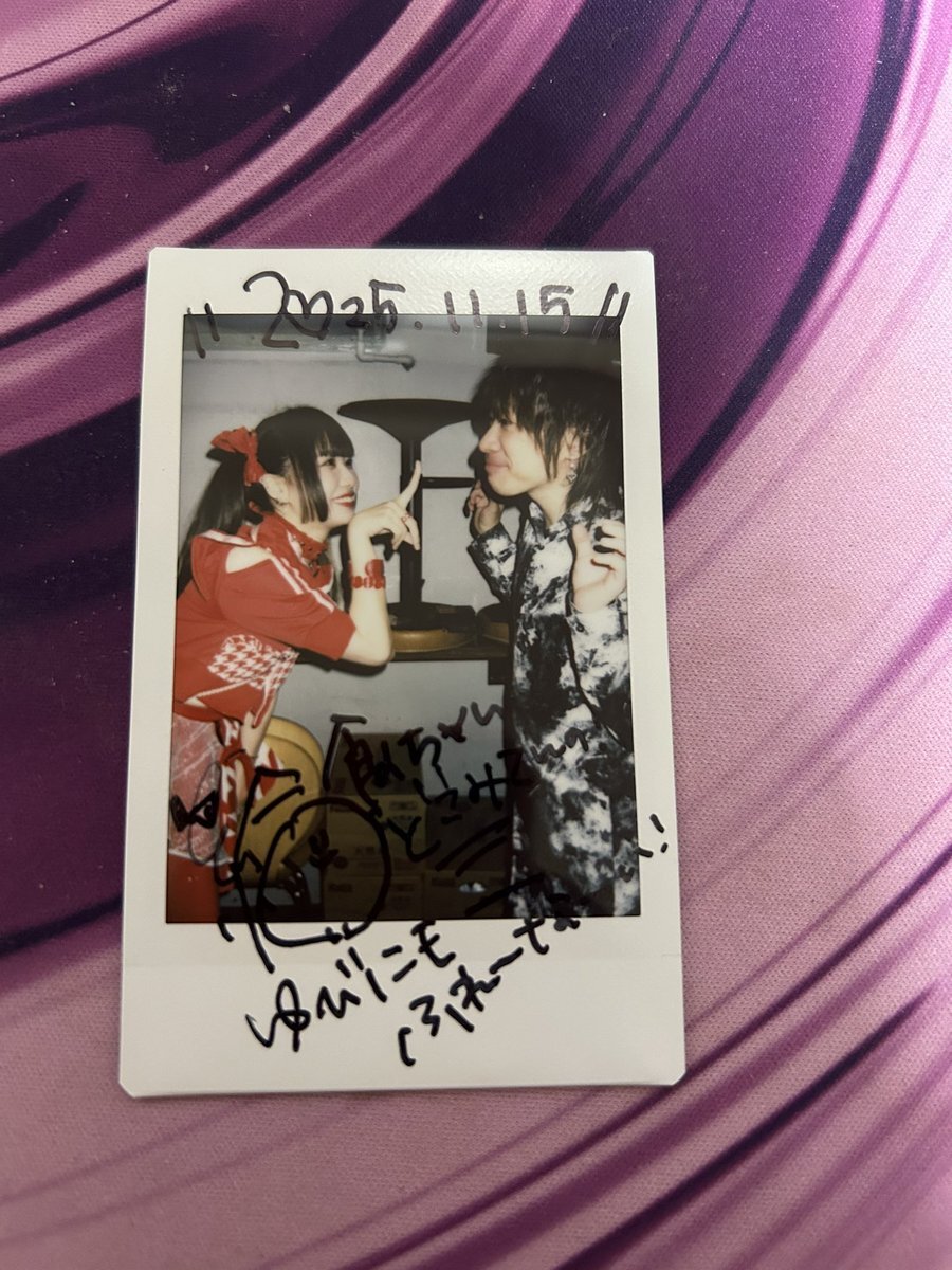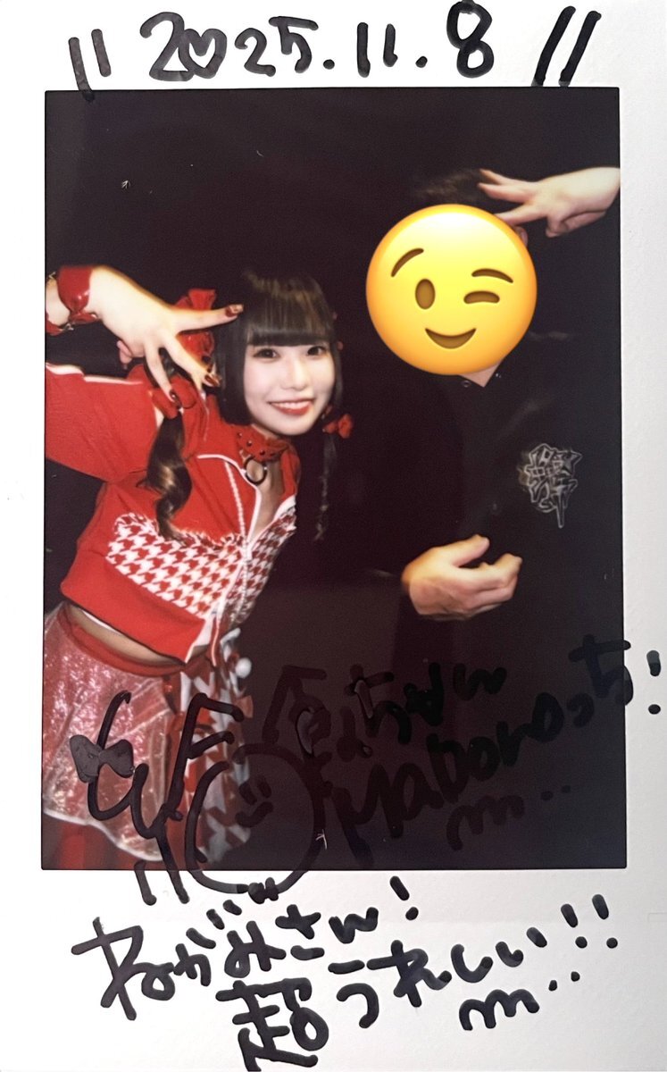 新ギルの出番までラウンジでぼんやりしてたら話しかけてもらって、ビラ配りはいつも節目がちにやり過ごす派だけど気づいたらチェキ撮ってた😳 早乙女ゆみのさんプロデュースの新しいグループとのことでなるほどのグループ名🥚❤️ #給食系推し事 pic.x.com/ZuvrwVBTrA x.com/maborocchi_inf…