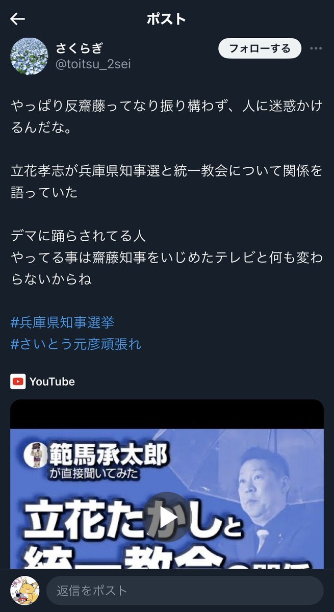 【悲報】#統一教会がんばれ を広めようとしている人、案の定 #さいとう元彦頑張れ な人だった。 pic.x.com/7liWnz7gdf x.com/himanaanya/sta…
