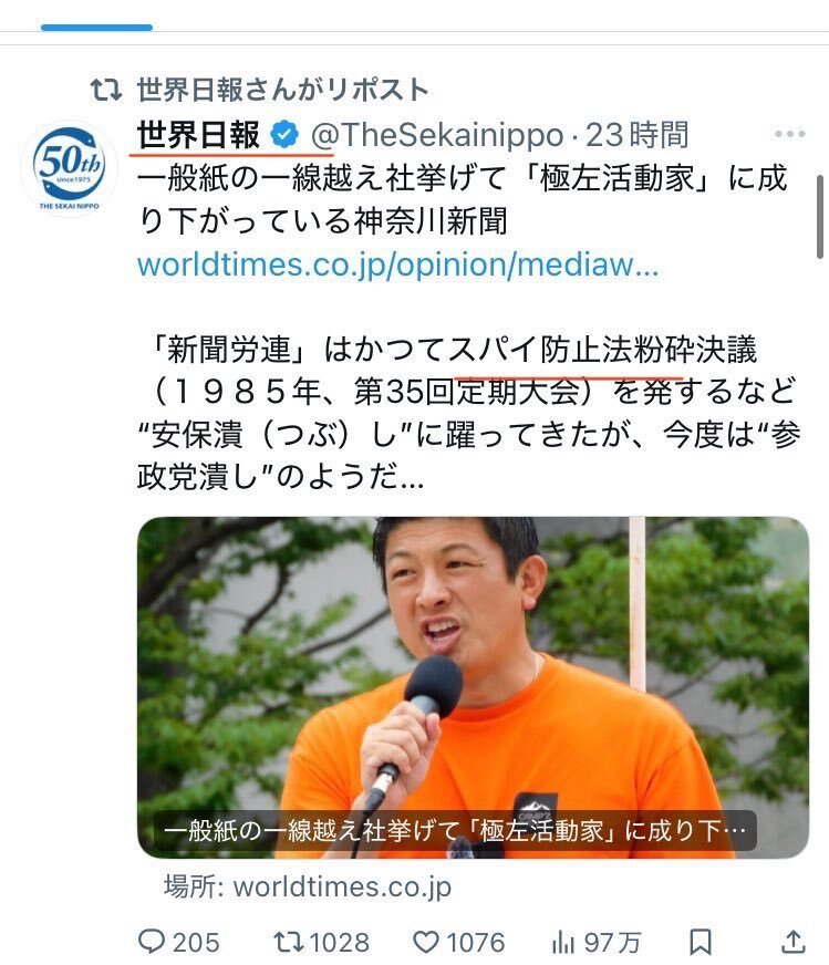 #高市やばい #統一教会との危険な関係 #拡散RPお願いします 何か消したみたいだから、皆 広めようぜ!カルト思想と繋がりを 消せない高市早苗を持ち上げる 世界日報こと、統一教会。 pic.x.com/of1tZiUlSA