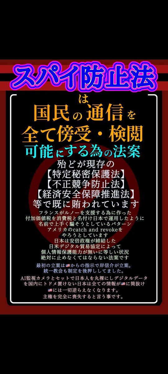 あーいらんいらん。 信用おけない奴らに、これ以上国民の権利や権力奪われてたまるか。 反日スパイと80年つるんでる政党、政治家の血脈が『スパイ防止法』って喚くの、どう考えてもオカシイだろ😰 参政党も一部の新人以外、自民党出身。 #参政党に騙されるな #統一教会と接点があった時点でアウト pic.x.com/4xd2it6hu2 x.com/rina_yoshikawa…