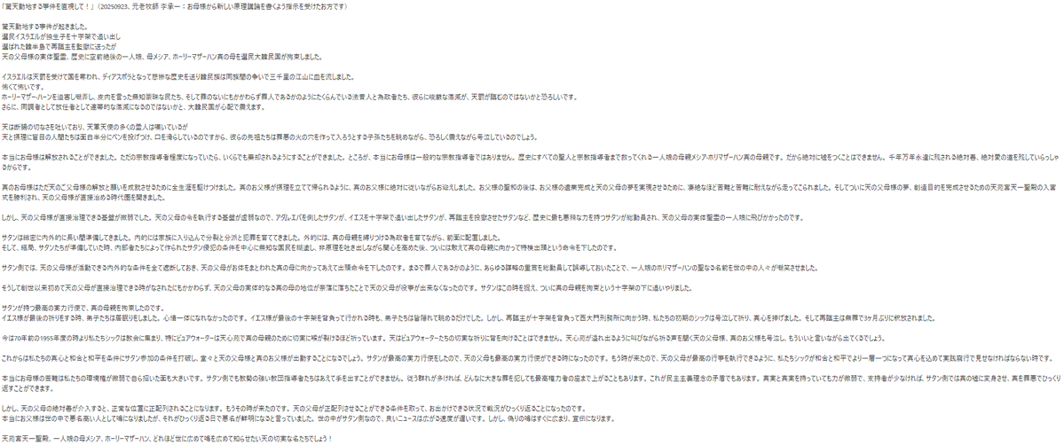 吐きそうな内容。なんか知人から勝手に送られて来たので掲載するが、一応ぶら下げとこう(画像消すかも)昔からこういう指導で、文氏の時から、あった。1週間断食や、全世界に対して、悔い改めの修業を要求されることも。あったな。サタンの勢力に対し私達が対抗できる基盤を作れなかったー。あほか