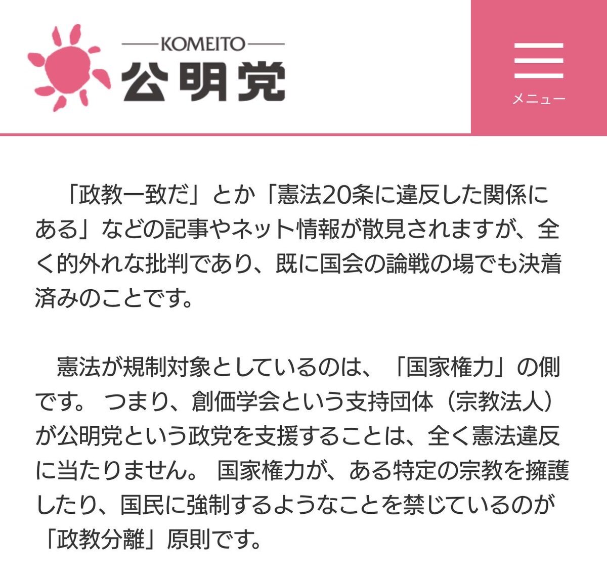 こんなこと言ってるのに、家庭連合の解散命令には全くコメントを出さない公明党はどうかなってるわ。 国が家庭連合の信者になれ!と一度も聞いたことないぞ。 公明党は宗教団体が支持する政党なら、解散命令について、一番声を上げるべきでしょ?