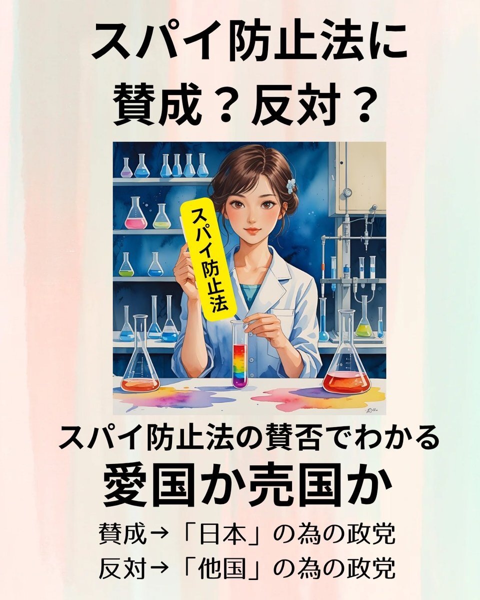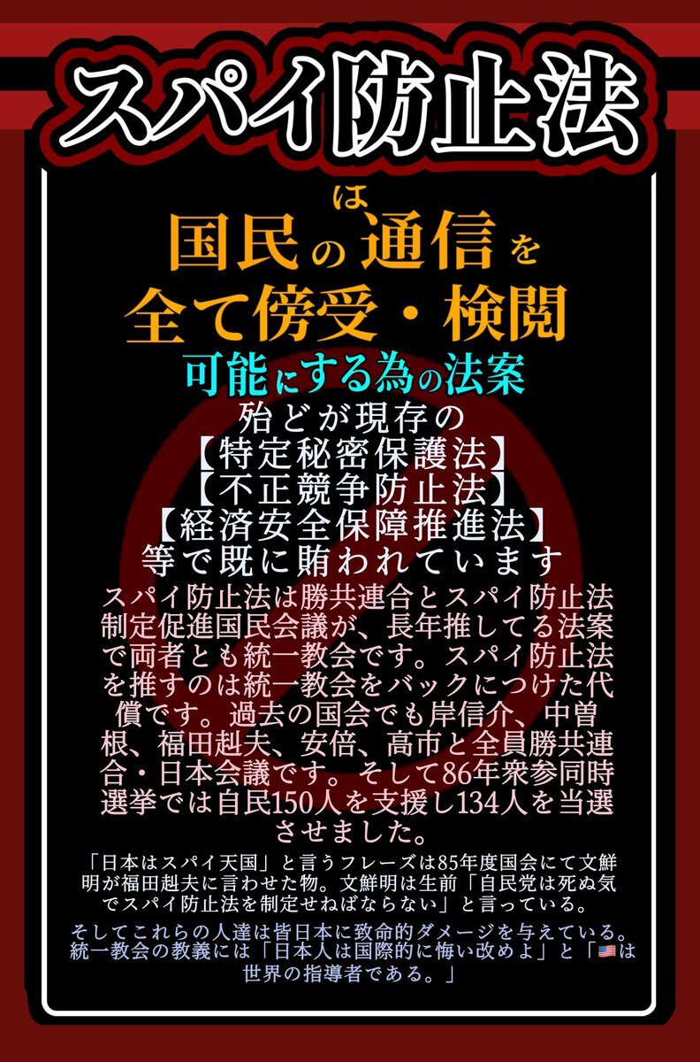 スパイ防止法はリトマス試験紙! 日本の為の政治家なのか、他国の為の政治家なのか 浮き彫りになる。 家庭連合は、友好団体である勝共連合を支えてスパイ防止法制定を望んできた。 家庭連合へのバッシングは、このスパイ防止法を制定させたくない勢力によるもの。 勝共連合 45年の悲願✨