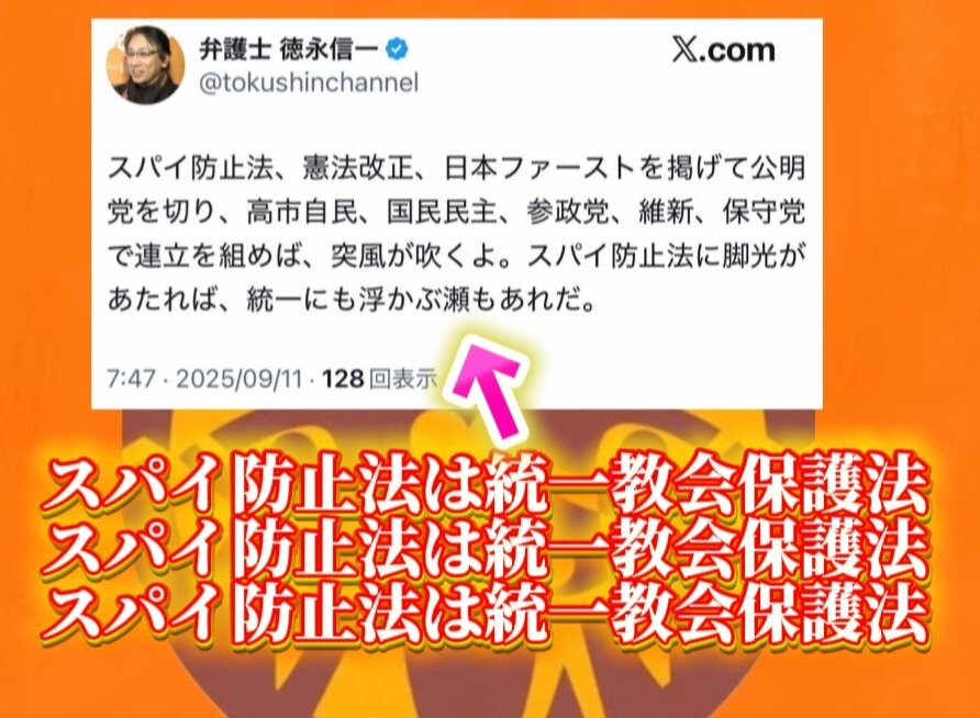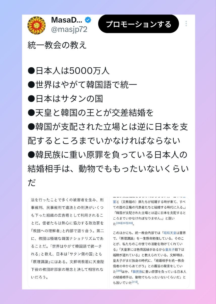 #統一教会は日本から出ていけ 出ていくべきは統一教会だろ?日本は韓国の為に貧しくなれ、生活水準を1/3にして軍拡せよだの反社だろ。統一教会=日本を七十年以上霊感商法で貧しくし幾多の家庭を壊した侵略者。都合の良い事だけ嘯き加害者が被害者面するな!日本を戦争に巻き込む反日勢力は出ていけ! pic.x.com/FI7dj0dX94 x.com/takeake0321083…