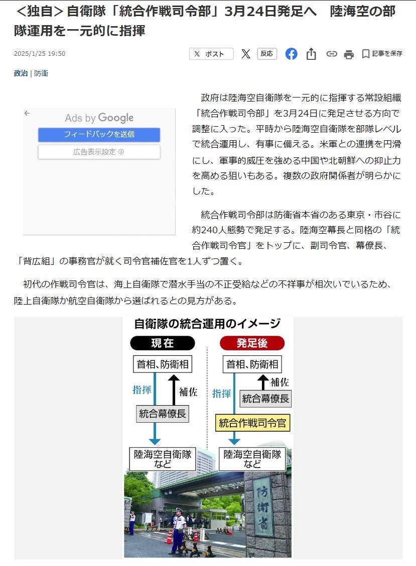 <独自>自衛隊「統合作戦司令部」3月24日発足へ  陸海空の部隊運用を一元的に指揮 #統合作戦司令部 #南雲憲一郎 pic.x.com/tDKPf4QYlg x.com/ishihamachanne…