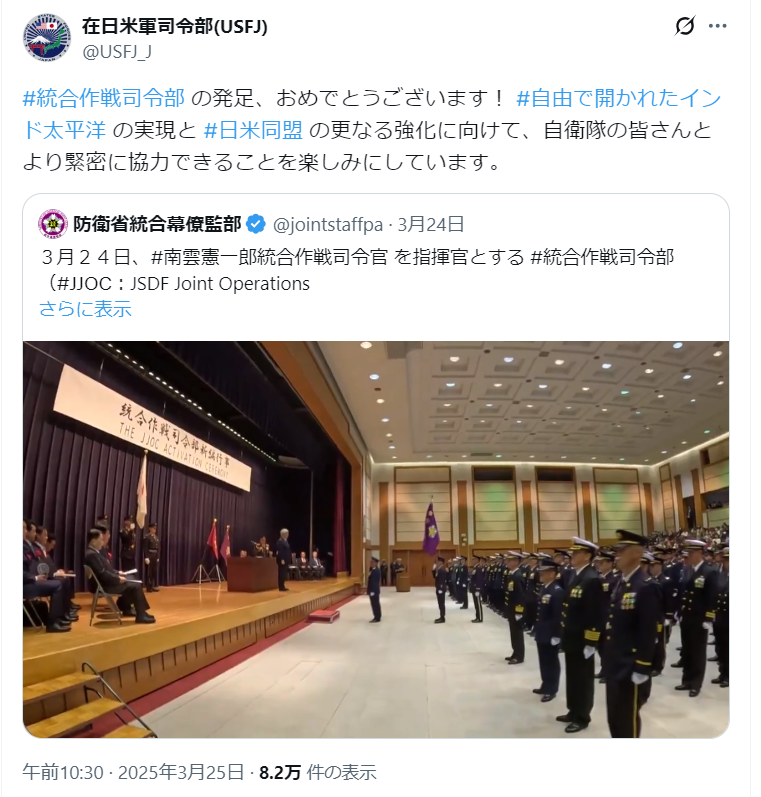 #統合作戦司令部 発足 「陸海空自衛隊を一元的に指揮する「統合作戦司令部」が発足。 有事や災害での初動を早め、米軍との連携強化につなげる狙い」 朝日新聞 2025年3月25日 asahi.com/articles/DA3S1…
