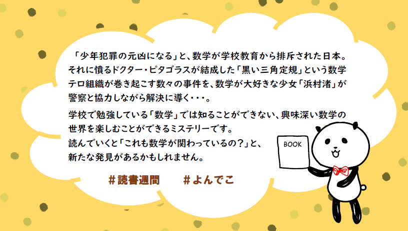 本日10月18日は #統計の日 ということで、 数学好きな しずとしょスタッフが選ぶ 🍂 #読書の秋 のおススメしたい本📚 今日は、文学(小説)の分野からご紹介! 『浜村渚の計算ノート』シリーズ (青柳碧人/著 講談社) みんな、#よんでこ 🐼📖 pic.x.com/SUe9HnJDp2