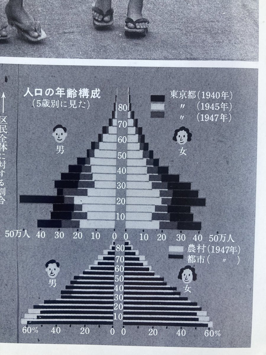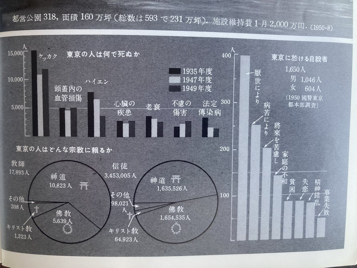 #統計の日 岩波写真文庫「東京 - 大都会の顔 1952」より。 戦後4〜6年の東京と、そこに暮らす人々の素顔を、様々な分類数値統計と、それを物語る写真で説明する興味深い一冊。 pic.x.com/0mg6IjAyeP