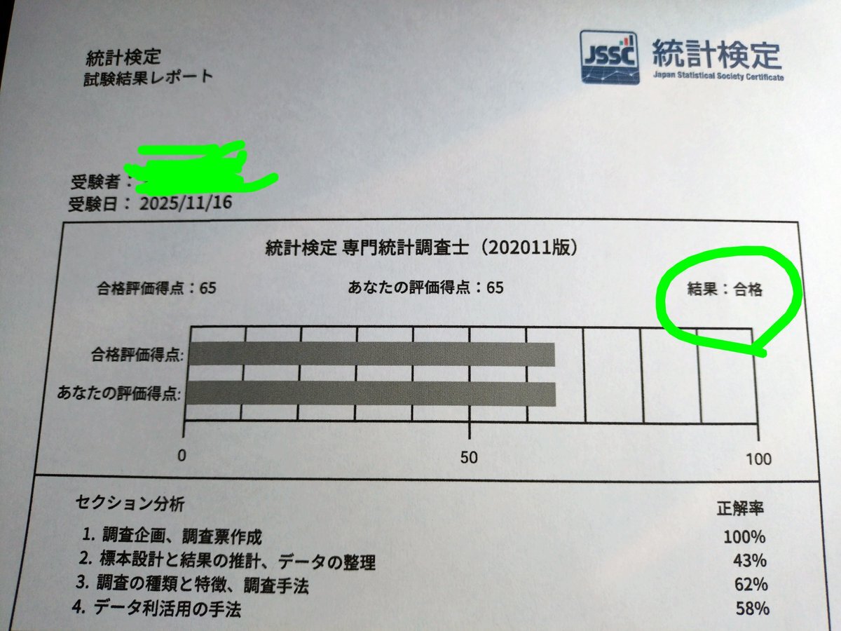 祝ってください。新たな専門統計調査士の誕生を…!(普通の統計調査士は2年前に取得済。)過去問だけじゃ解けない問題たくさん出題されて焦った〜。まじギリギリだった…。 #専門統計調査士 #統計検定 pic.x.com/s2w0y9vrC1