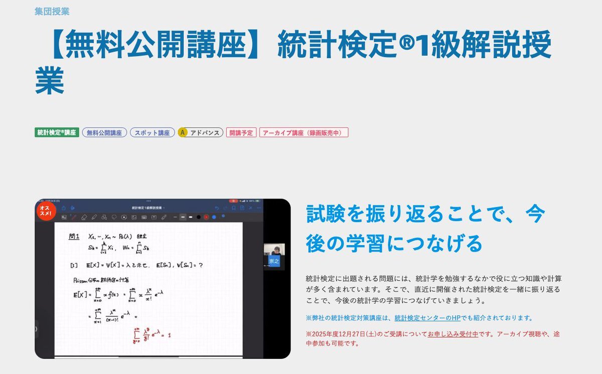 統計検定1級を受験されたみなさま、お疲れさまでした。 試験問題を振り返る『統計検定1級 解説授業』を今年も開催します。参加費は無料です。 今回受験された方、受験をご検討中の方、試験問題を通して統計学を深めたい方、ぜひご参加ください。 sugakubunka.com/group-course/c… #統計検定 pic.x.com/F6cEWLsST7