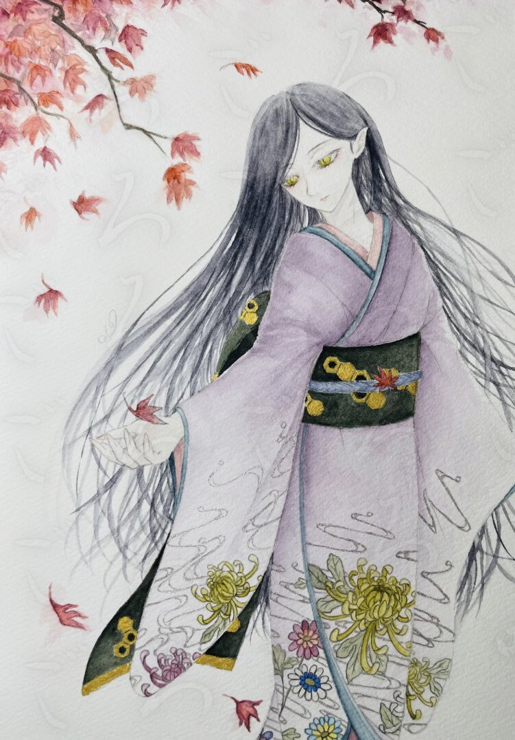 『鬼女・紅葉(もみじ)の絵姿』 ーある日。 私は、ついに見つけた。 紅葉の中を舞うように歩く、 この世のものとは思えない、 美しい鬼女(ひと)。 この世の誰にも。 彼女の美しさを描けはしないー。 鬼女に魅入られた“私”は、毎日彼女を盗み見ては絵を描く。 そんな場面が浮かびました。 #絵墨 pic.x.com/WUAScuW5Kz