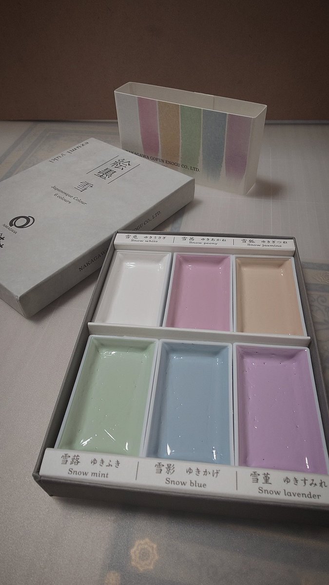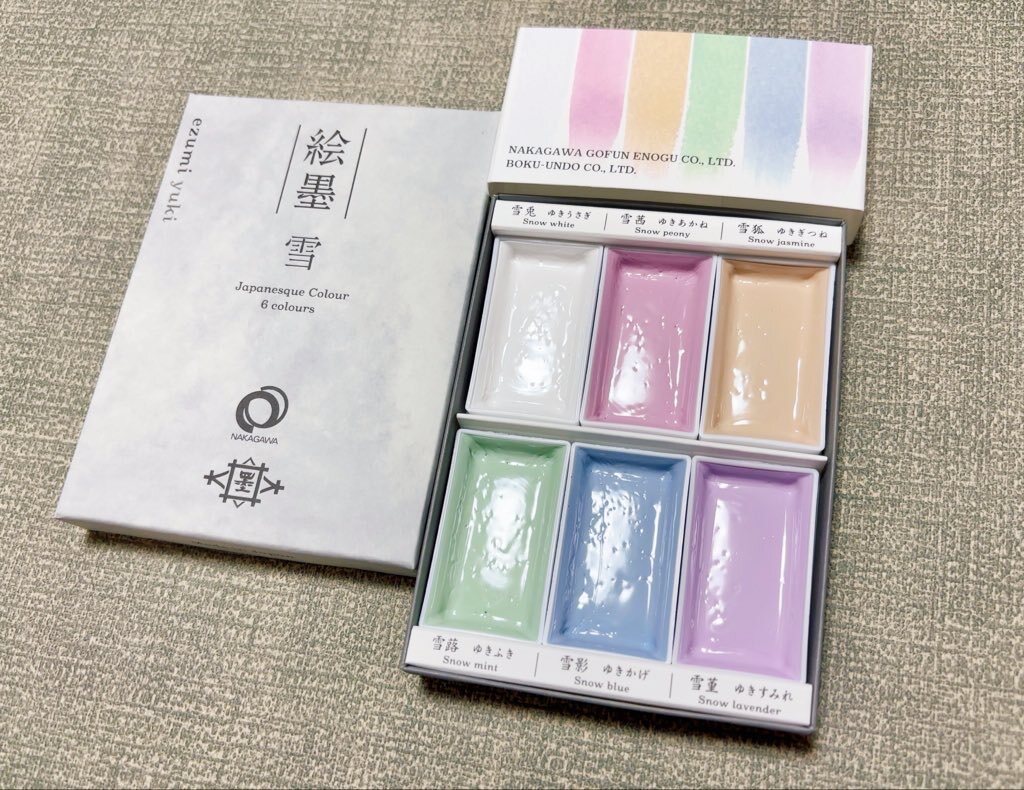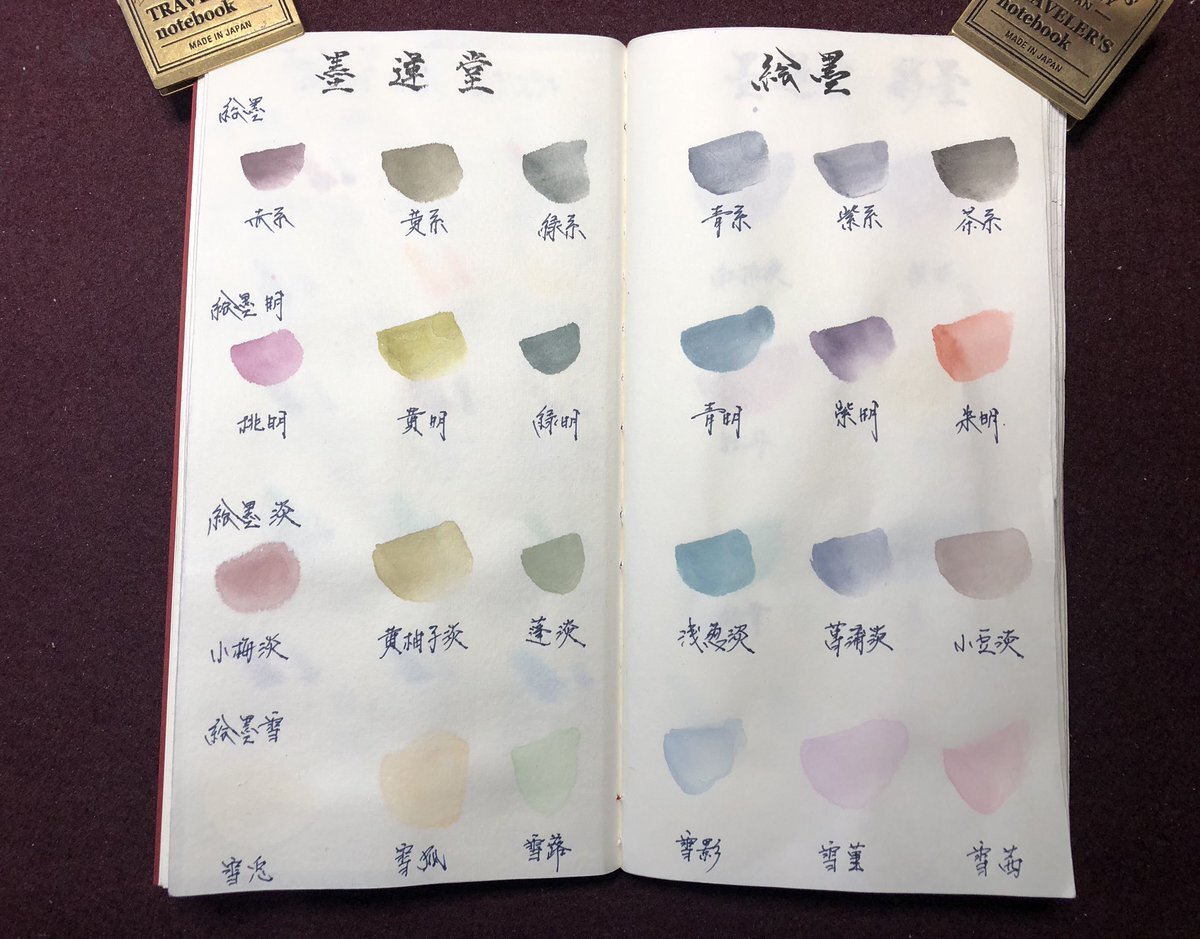 「墨運堂」さんと「ナカガワ胡粉」さんが共同開発した『絵墨 雪』を購入したので、僕のトラベラーズノートの色見本帳に色を挿してみました。(画面一番下の六色)  実に優しい色です☆ #墨運堂 #絵墨 #絵墨雪 #彩墨 #日本画 #画材 #トラベラーズノート #色見本 #travelersnotebook pic.x.com/VIDC51XdiA