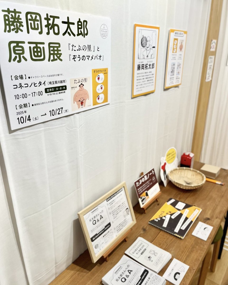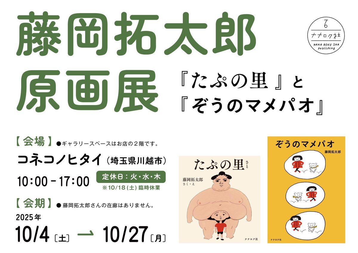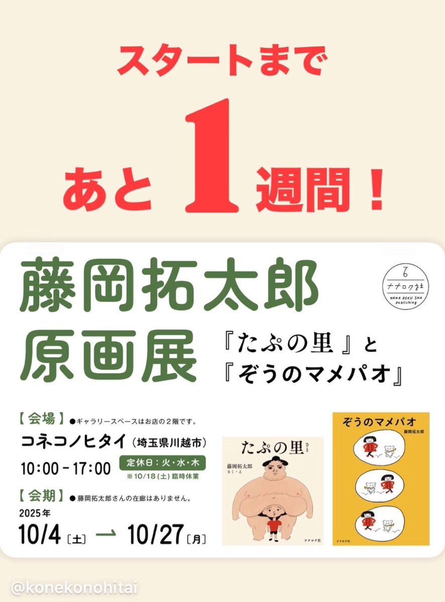 いよいよ来週から! ╰━━━━━v━━━━━╯ 🖼️ #藤岡拓太郎 #絵本原画展 ●10/4(土)〜27(月) 10〜17時 *店休日:火・水・木、18土 ●原画展示作品 #たぷの里 #ぞうのマメパオ ●ちいさい絵本屋 コネコノヒタイ 2F (埼玉県川越市砂858-16) ▼詳細 ehonnavi.net/sp/sp_event.as… pic.x.com/Ac6GO7KszA