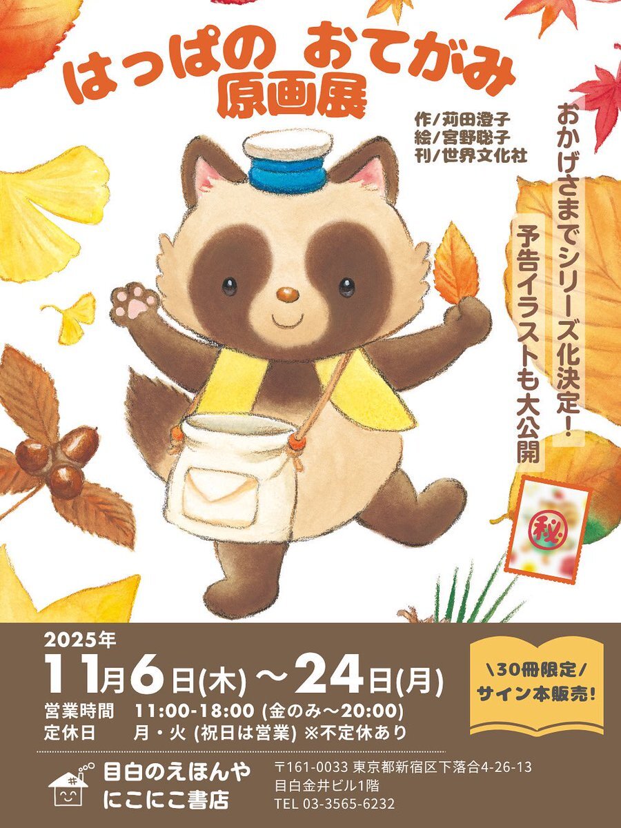 目白のえほんや にこにこ書店さん @nikoniko_books で、『はっぱの おてがみ』(作/苅田澄子 絵/宮野聡子)原画展を開催します🍁11月6日(木)~24日(月・祝)まで。 続編となる春のお話のイラストも初公開します! ご購入された方には、特典シールをプレゼント🎁ぜひお越しください✨ #絵本原画展 pic.x.com/gRMs9XKGwN