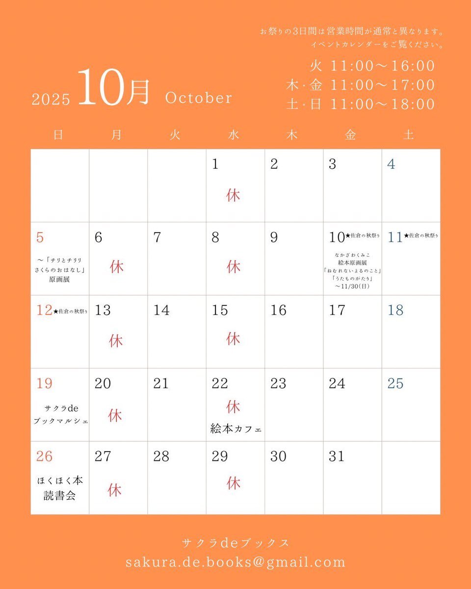 今日はお店は都合によりお休みです🙇🏻‍♀️ 9月のご来店ありがとうございました! 10月のカレンダーです🗓 来月もどうぞ宜しくお願いいたします📕☕️ #本と喫茶 #佐倉市 #絵本原画展 #読書会 #シェア型書店棚主さん募集中 x.com/sakura_de_book…
