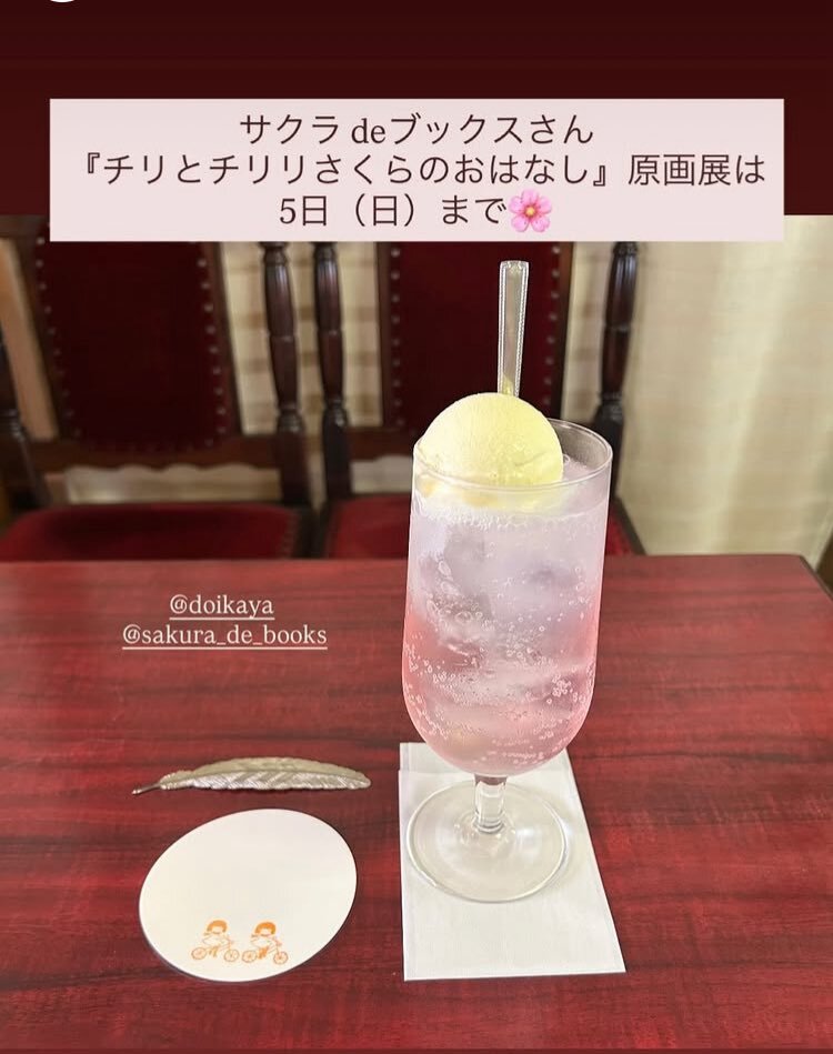 約1ヶ月店内を桜で満開にしてくれた『チリとチリリさくらのおはなし』原画展、会期はこの土日まで🌸 原画展記念メニュー 桜のクリームソーダもたくさんの方に喜んでいただけています😊 土日の営業は11~18時 お待ちしています🎶 #佐倉市 #本と喫茶 #チリとチリリさくらのおはなし #絵本原画展 x.com/kayadoi/status…