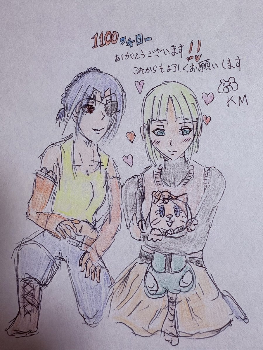 1100フォローオーバー記念に描かせていただきました。ハウンドと碧の義姉妹(姉妹じゃない)で感謝イラスト描かせていただきました。 腕の中の猫さんはギルドの後輩受付嬢です。 これからも宜しくお願い致します🙇 #OC #一次創作 #記念イラスト #感謝 #絵師さんフォロバ100 #絵柄が好みな人と繋がりたい pic.x.com/idowzWka4O