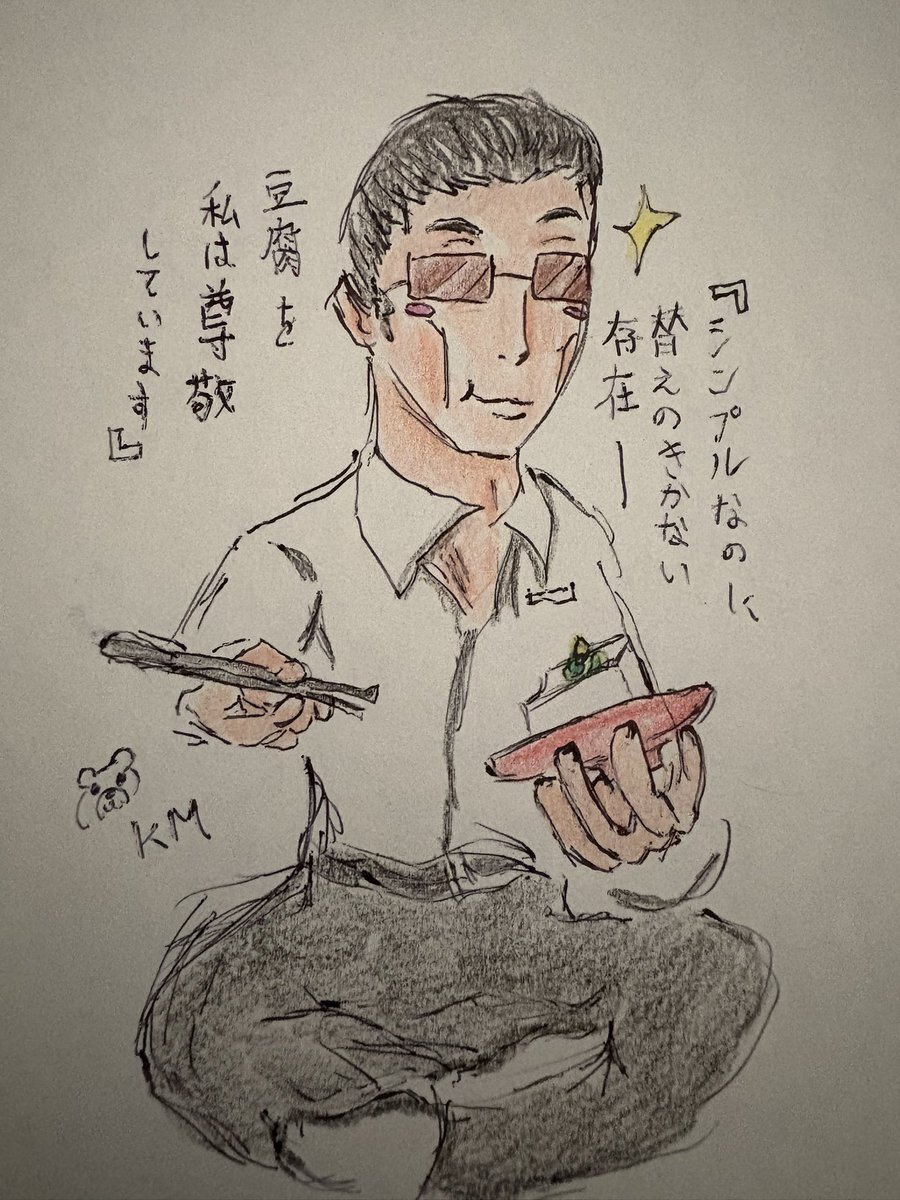 朝活として仕事あがりの能登半次郎さんを。 今日は豆腐の日らしいので。実は能登さん、大好物は豆腐!飲み屋でも酒より先に豆腐のタイプ☺️ #OC #一次創作 #豆腐の日 #アナログイラスト #絵師さんフォロバ100 #絵師さんと繋がりたい #絵柄が好みな人と繋がりたい #自創作に狂っている人間と繋がりたい pic.x.com/VwVnwqjmzQ