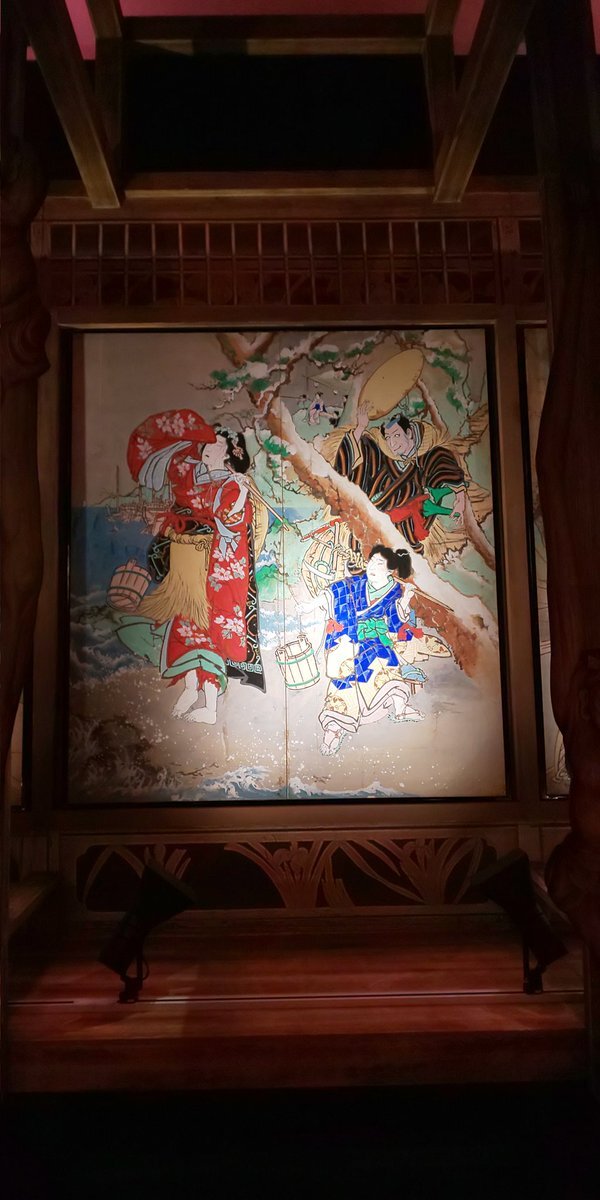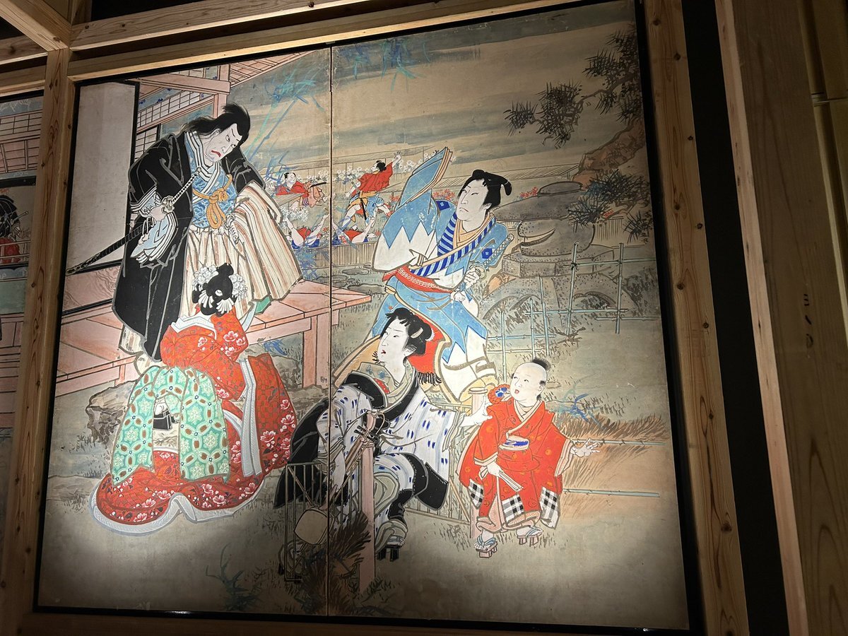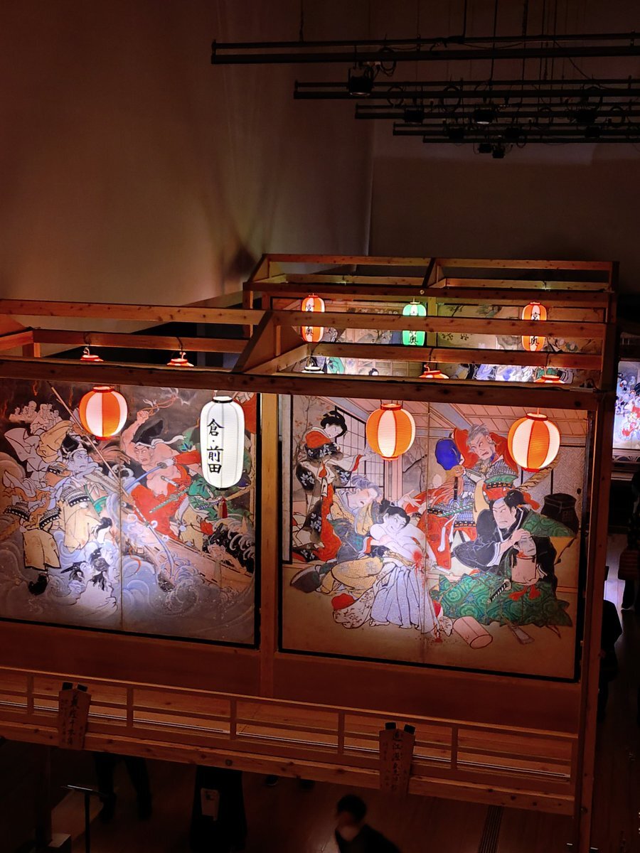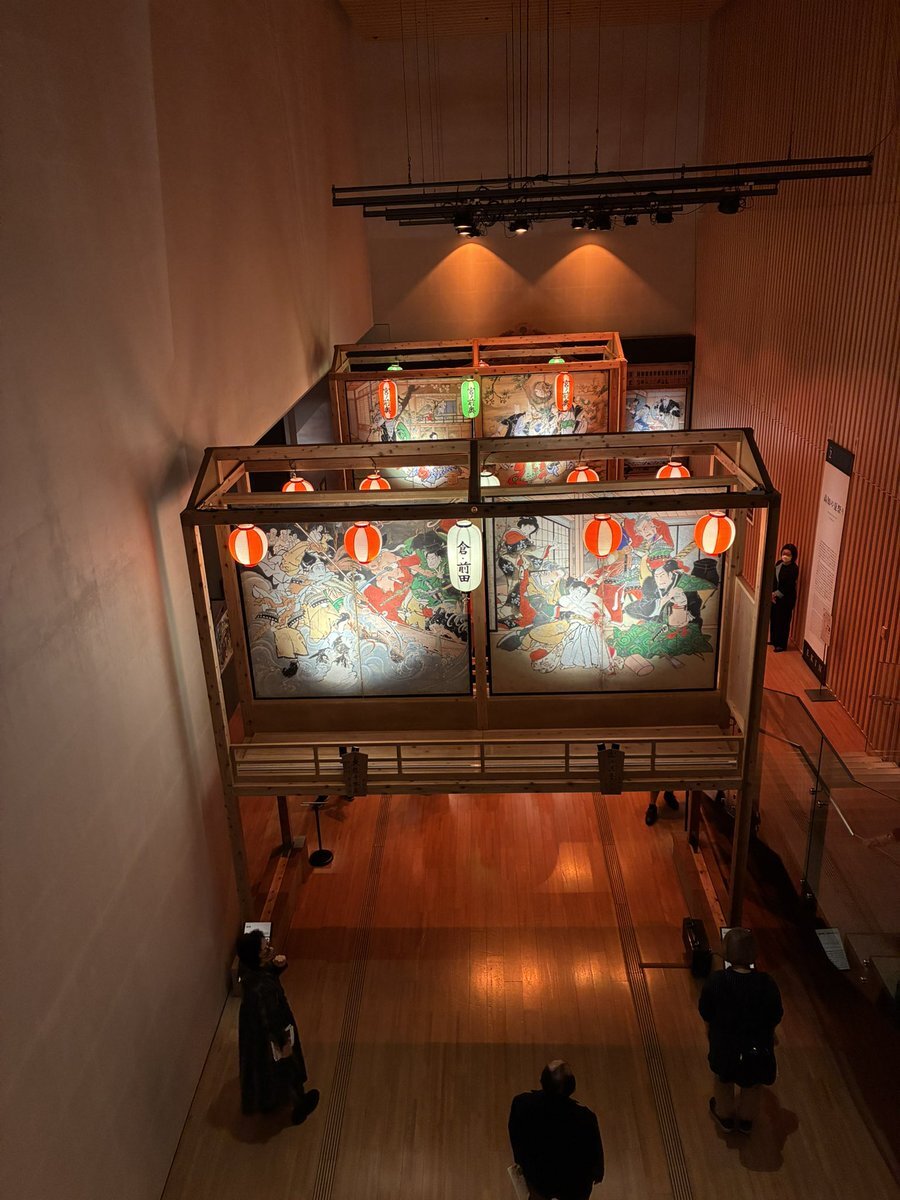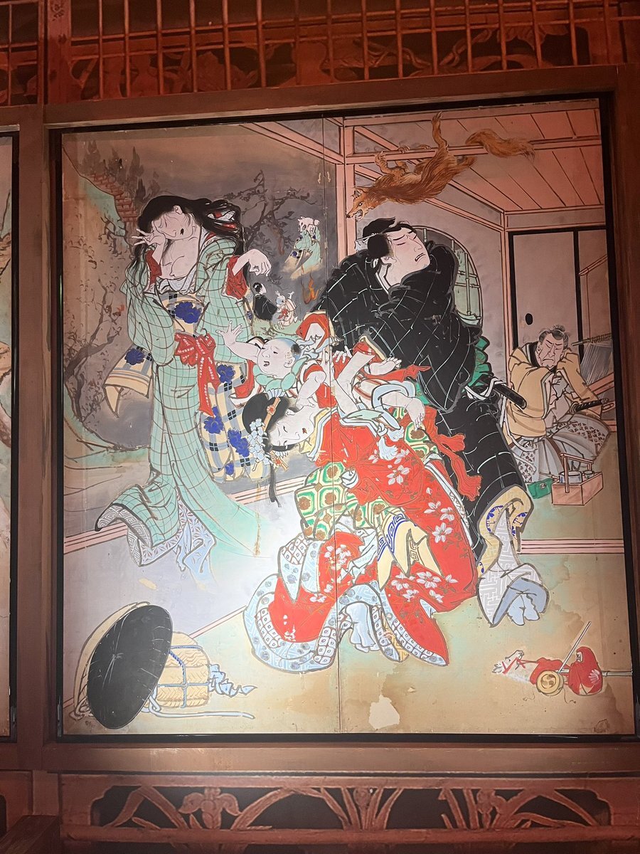 #絵金展 『紙雛図』は鼓を持つ女雛の脇で踊り出しそうな男雛。 あべのハルカスの絵金展とは、いろいろ違っていた。 演出も凝る。『伊達競阿国戯場累』と絵馬屋台は明るさを変え、絵金祭を再現。 #Bura_Bi_Now #ぶら美 pic.x.com/1yUdlXUJEX