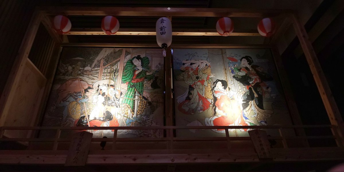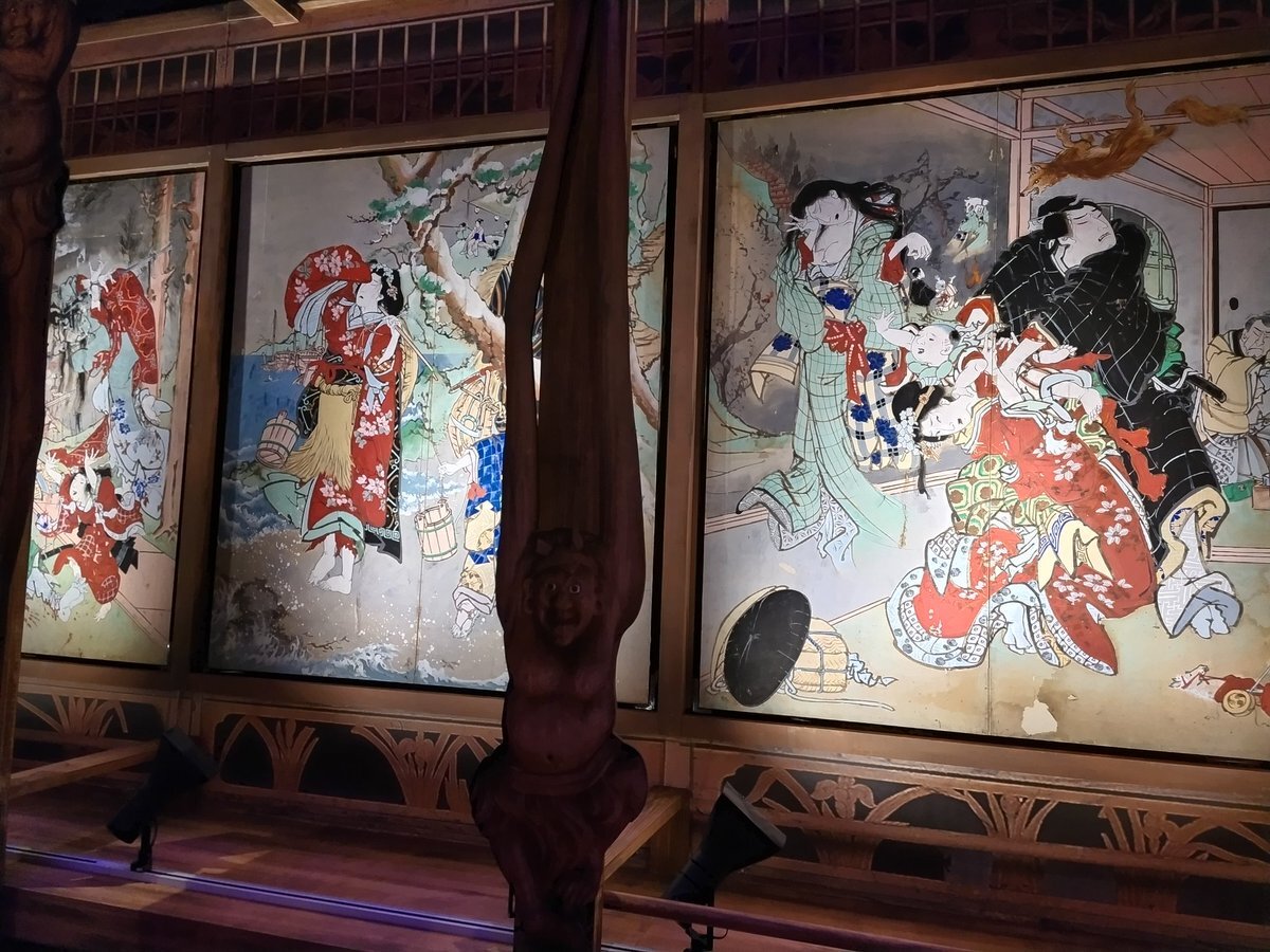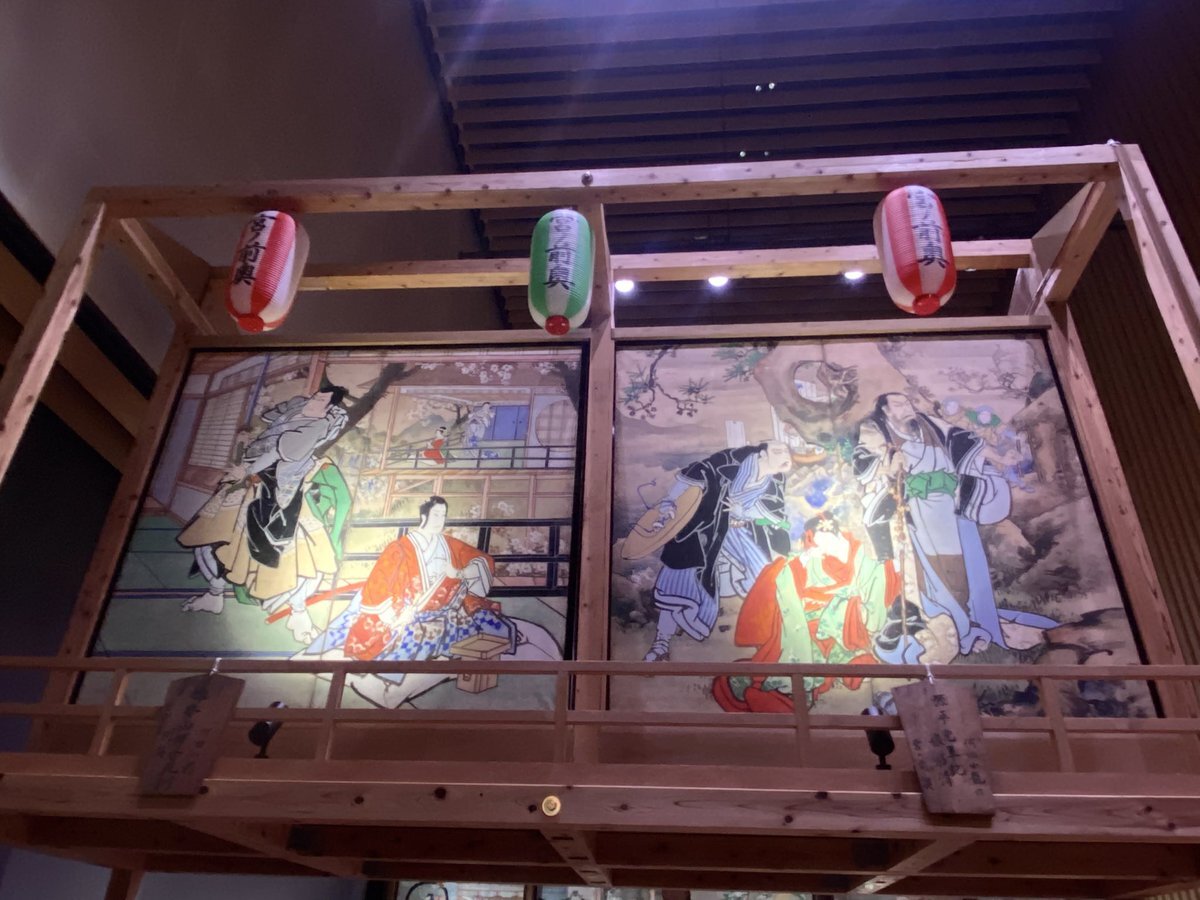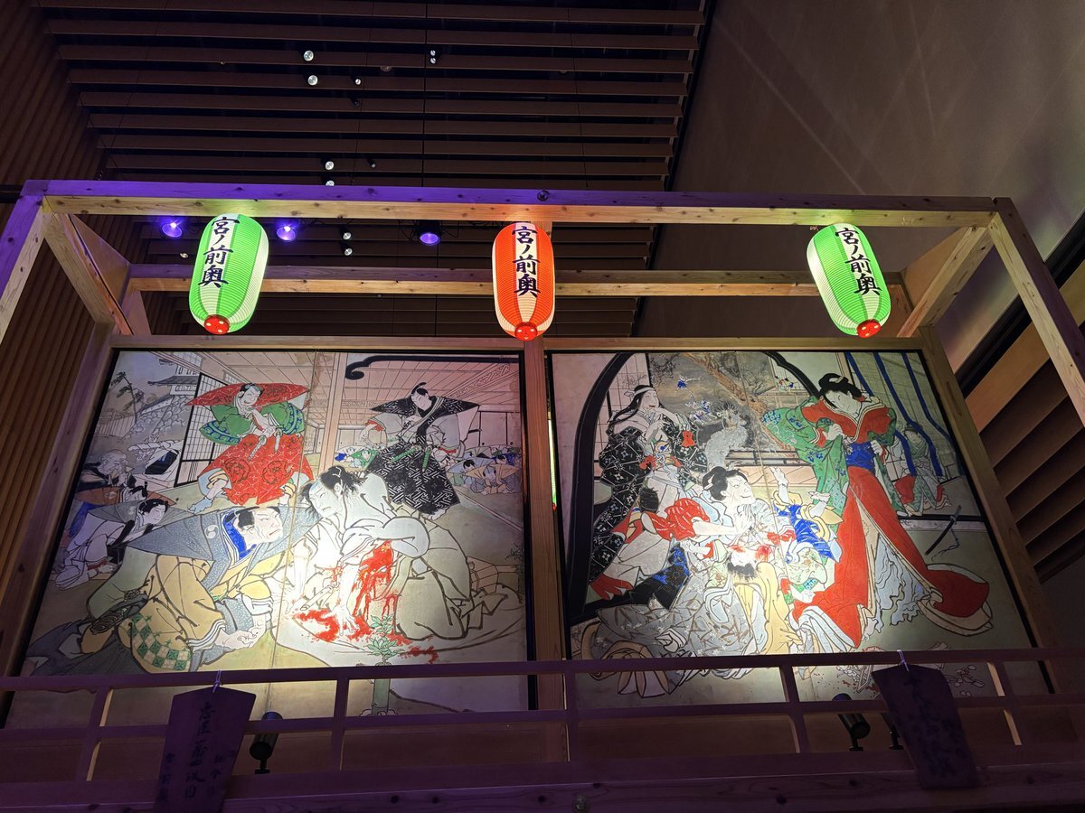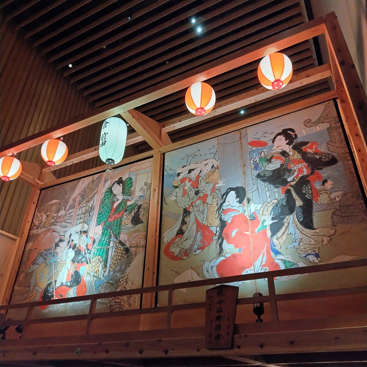 #絵金展 『紙雛図』は鼓を持つ女雛の脇で踊り出しそうな男雛。 あべのハルカスの絵金展とは、いろいろ違っていた。 演出も凝る。『伊達競阿国戯場累』と絵馬屋台は明るさを変え、絵金祭を再現。 #Bura_Bi_Now #ぶら美 pic.x.com/1yUdlXUJEX