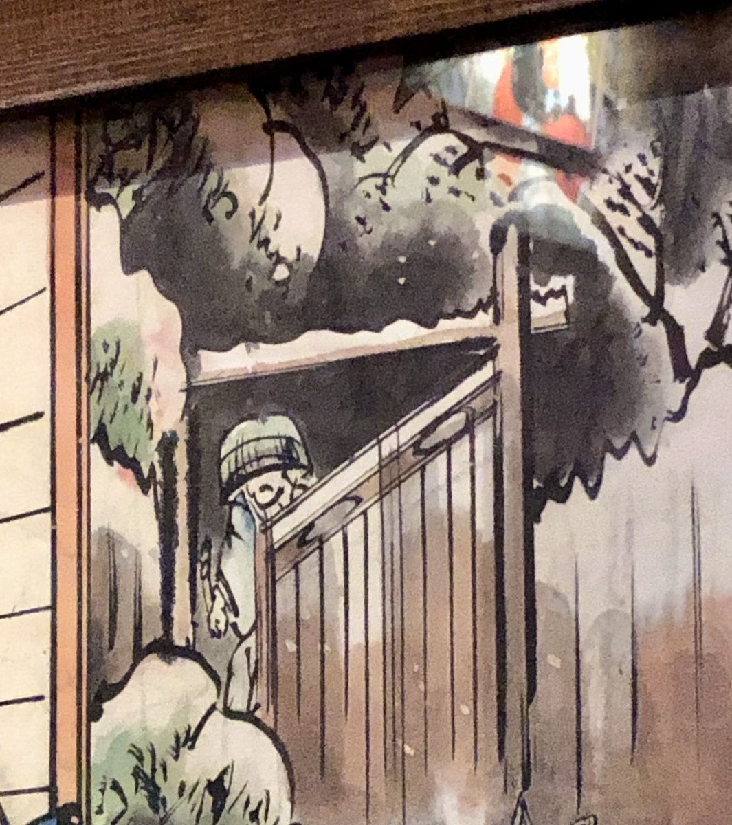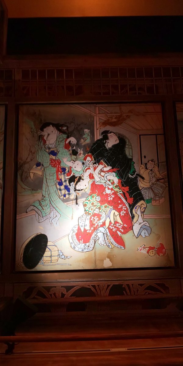 #絵金展 『蝶花形名歌島台小坂部館』は、母親姉妹のキャットファイト。2人の子の表情の違いも気になる。 件の女子生徒のなかには、救いのないストーリー解説にはっとする生徒も。 遊び心ある屏風も。 『義経千本桜鮓屋』は背後に小さくなれ寿司を食べる従者が。 #Bura_Bi_Now #ぶら美