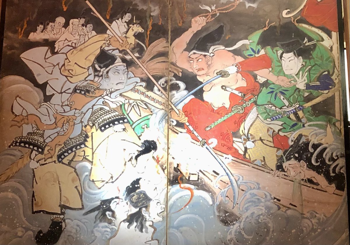 #絵金展 →そのユーモアの例として『船弁慶』をよく見ると船のはしっこで吐いちゃってる…。 ちょうど撮影可の絵馬台にあります。 pic.x.com/qJmAijlCFU
