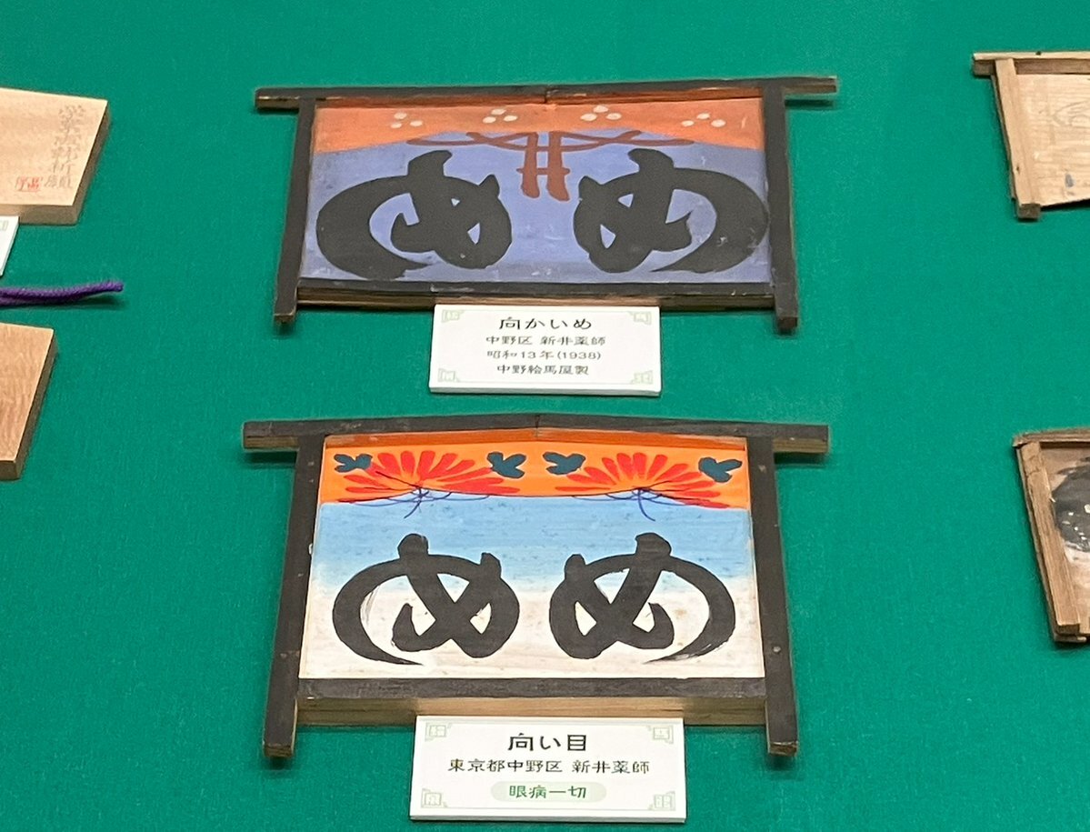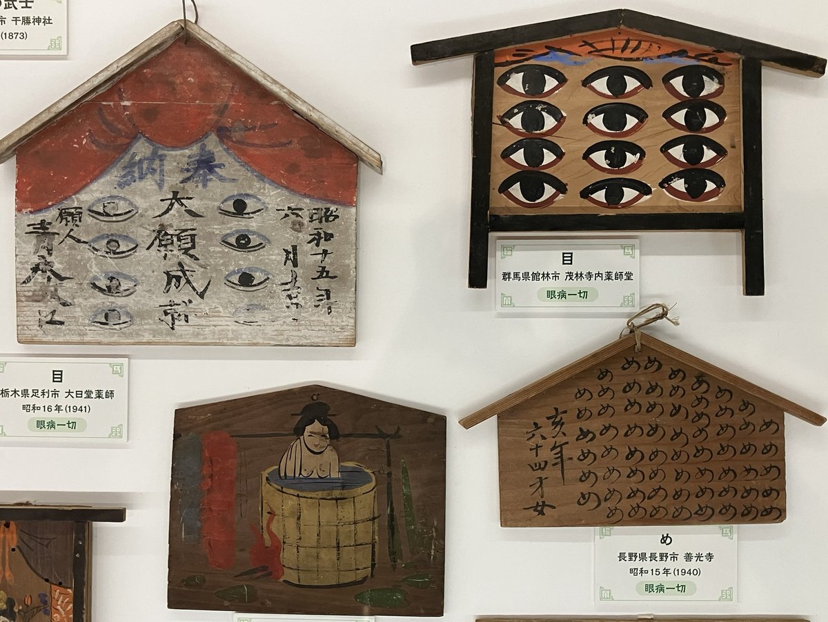 〈企画展「#絵馬展」開催中〉 展示室に並んだ絵馬の絵柄で多いのは、安産や子育て、病気治癒の願いを込めたものです。 中でも目につくのは、眼病治癒の願い。 眼病が人々の中で恐れられていた病気であったことがうかがえます。 区内の新井薬師には向い目の絵馬が現代でも奉納されています。 pic.x.com/8xJenyV9YN